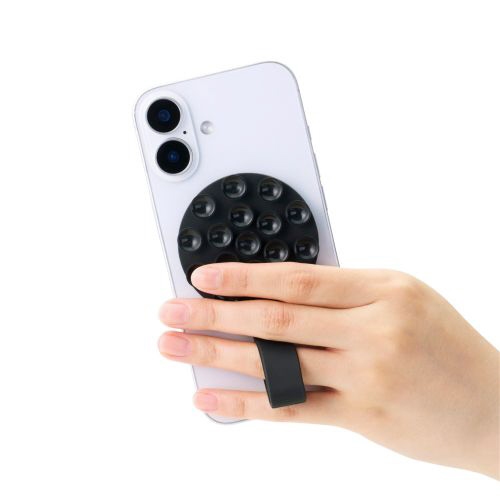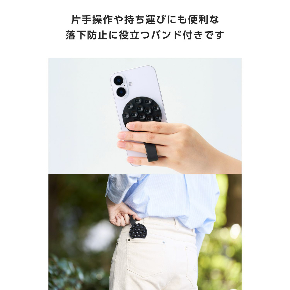 スマホホルダー 吸盤 MagSafe対応 iPhone用 落下防止バンド付 強力固定 動画視聴 自撮り 壁鏡ガラス貼付 シリコン コンパクト TakoPita ブラック P-TKPTMAGB01BK