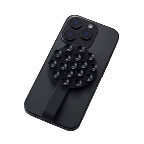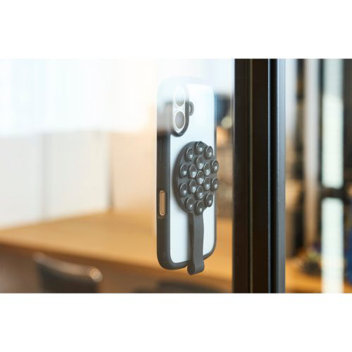 壁や鏡、窓ガラスなどの平らな面にシリコン吸盤で簡単に吸着可能。スマートフォンを自由な向きで固定できます。