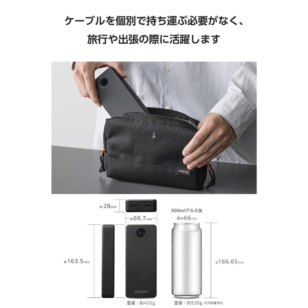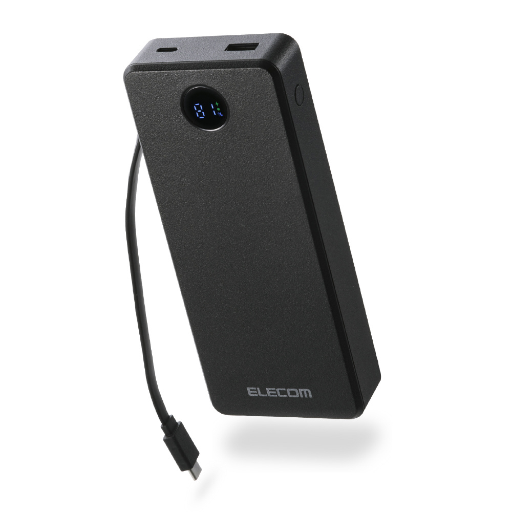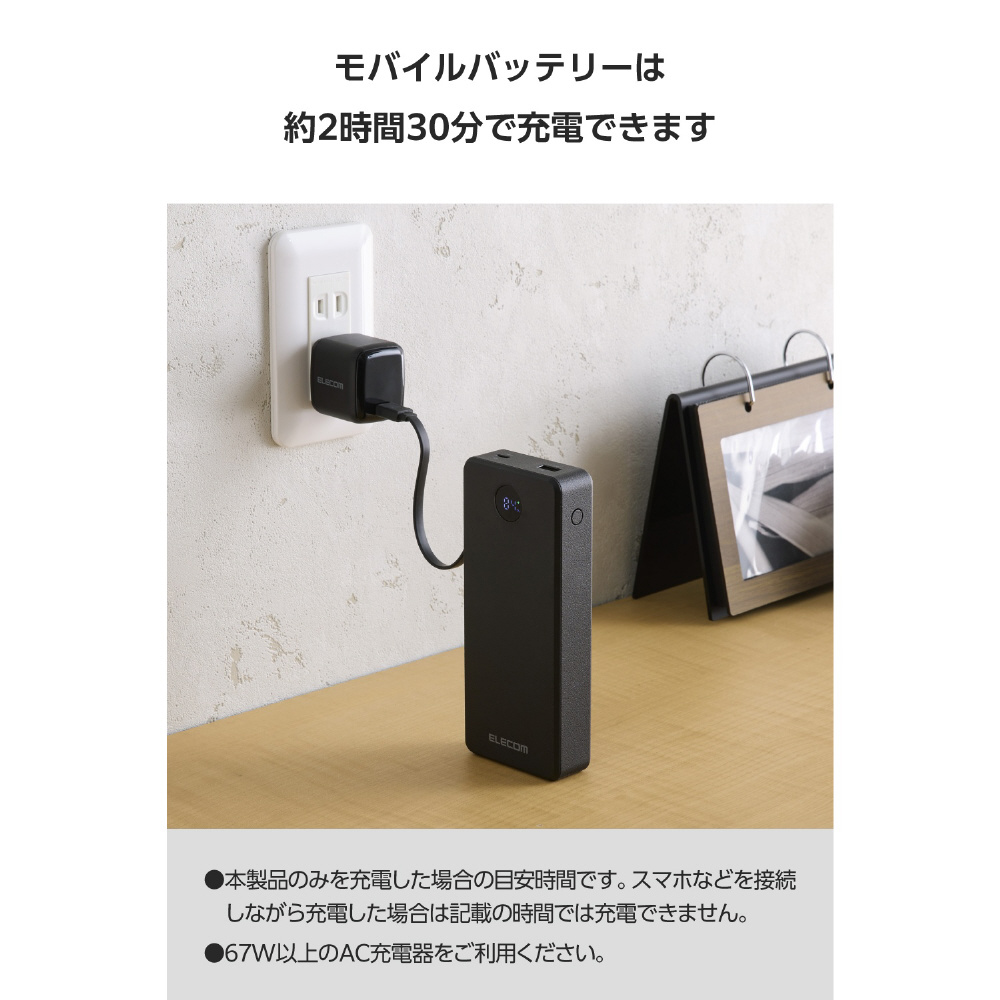 モバイルバッテリー 20000mAh 67W充電 ケーブル一体型 ノートPC対応 大容量 残量表示 PSE適合 旅行/出張/防災 ブラック DE-C77-20000BK