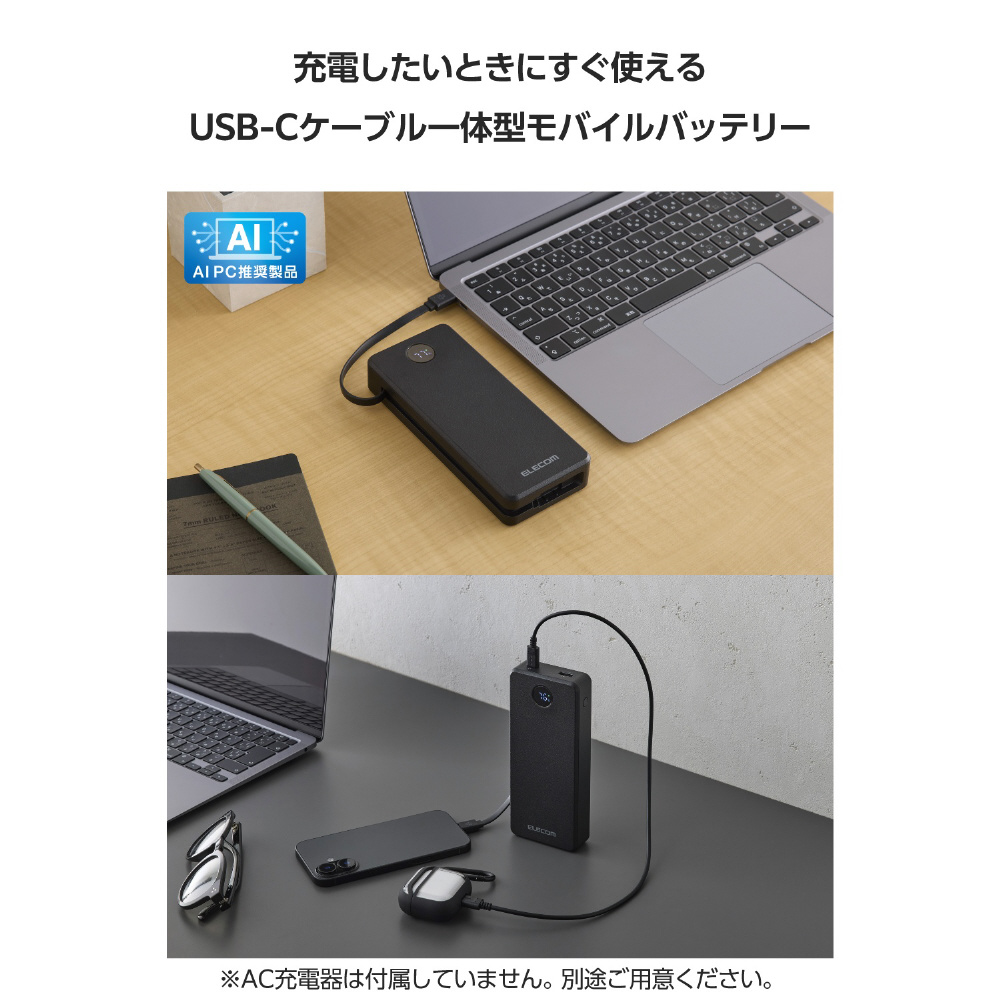 USB Type-C(TM)ケーブル一体型・20000mAh容量のモバイルバッテリーです。