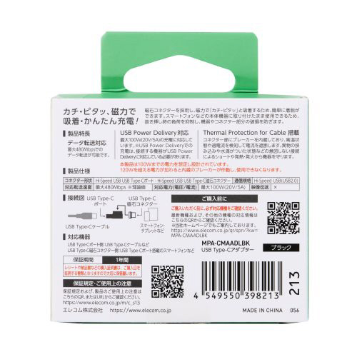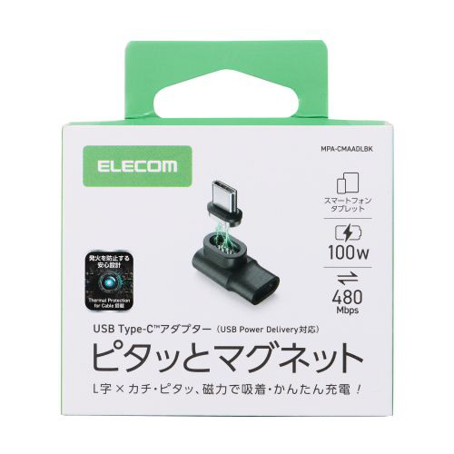 USB-C マグネット 変換アダプタ L字型 100W PD対応 着脱式コネクタ ブレーカー内蔵 ブラック MPA-CMAADLBK