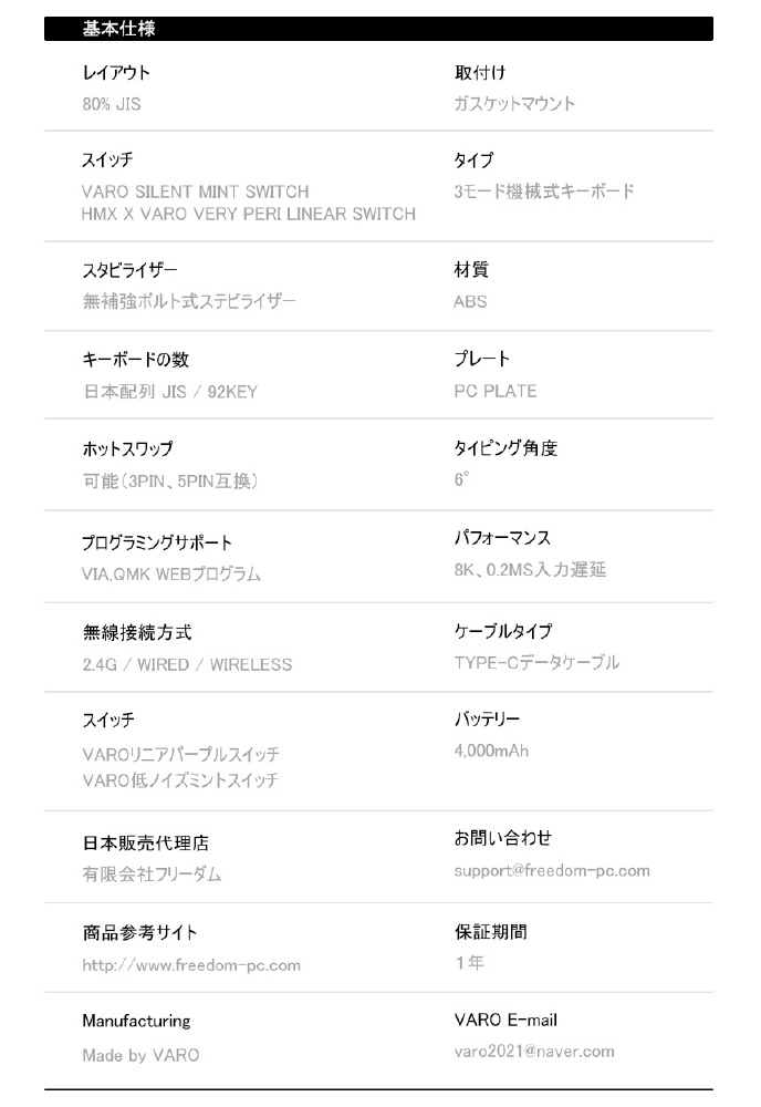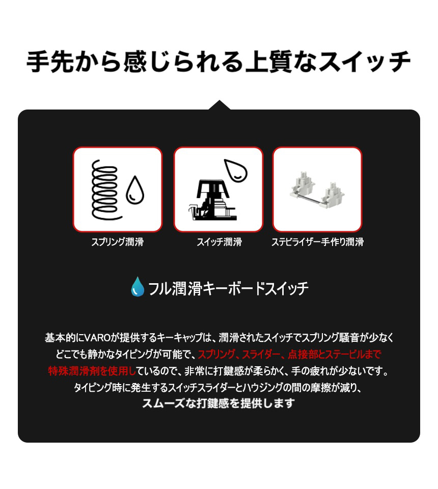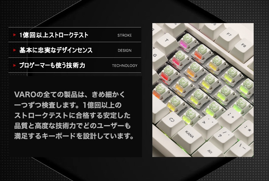 シンプルで基本に忠実なデザインセンス。シンプルなデザインに安定した品質と最新の技術が加わったキーボード。付属のカラーキーキャップはどこにもないVAROならではの魅力的な色にしました。