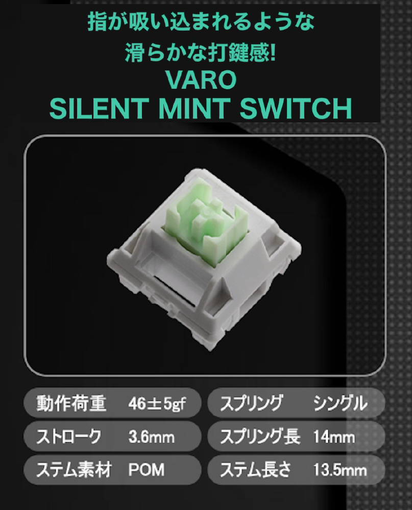 8kHzポーリングレート、入力遅延0.2msの応答速度に対応しており、ビジネスだけではなくゲーミングにも最適なキーボードです。指が吸い込まれるような滑らかな打鍵感のSILENT MINTスイッチを採用、ビジネスシーンに最適な静音設計で優しくスムーズな押下感が特徴です。またQMK/VIA WEBプログラムを採用し、作業効率を向上させます。