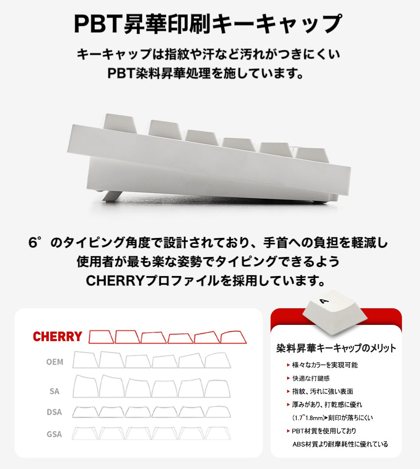 PBT素材・昇華印刷を採用したキーキャップは、汚れにくく長期間使用しても印字が消えにくい、非常に優れた耐久性と快適な打鍵感が特徴です。