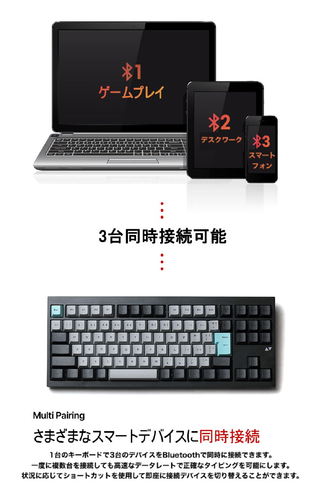 有線、2.4GHz、Bluetoothの3モードに対応しており、様々な環境で自由に使用できます。Bluetooth接続では3台のデバイスに同時接続ができ、パソコンやタブレット、スマートフォンを切り替えながら作業ができます。ショートカットを使えば、瞬時に接続デバイスを切り替えることができます。