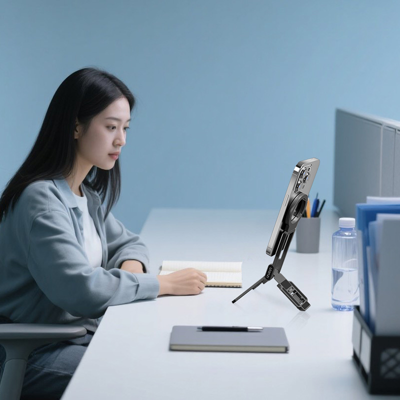 隠しフック設計で、ディスプレイ、椅子背もたれ、ドア枠、手すりなどに掛けられ、瞬時に高角度視点に変身。