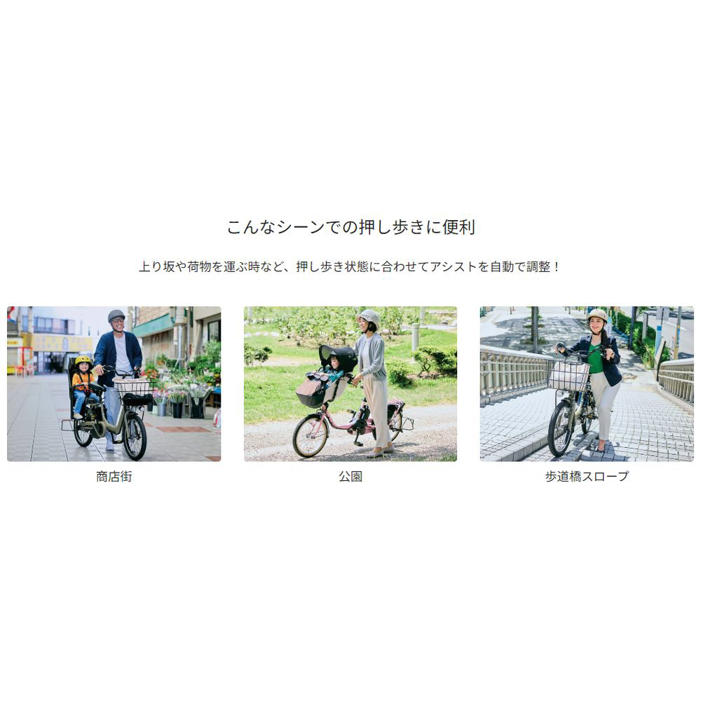 上り坂や荷物を運ぶ時など、押し歩き状態に合わせてアシストを自動で調整!(商店街、公園、歩道橋スロープ)