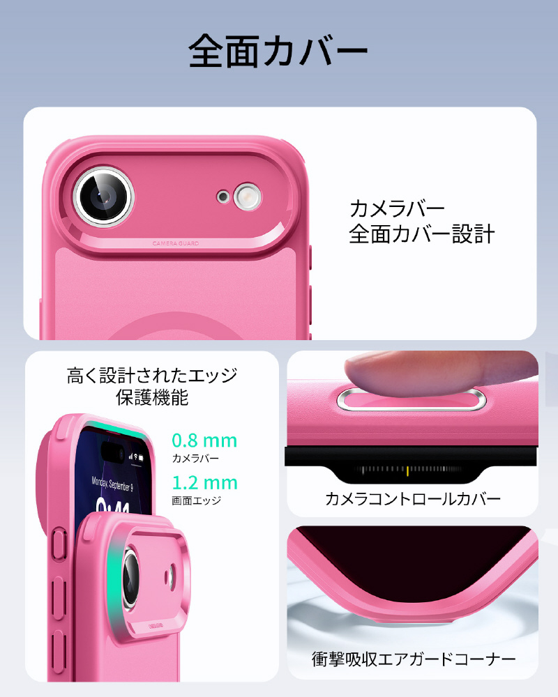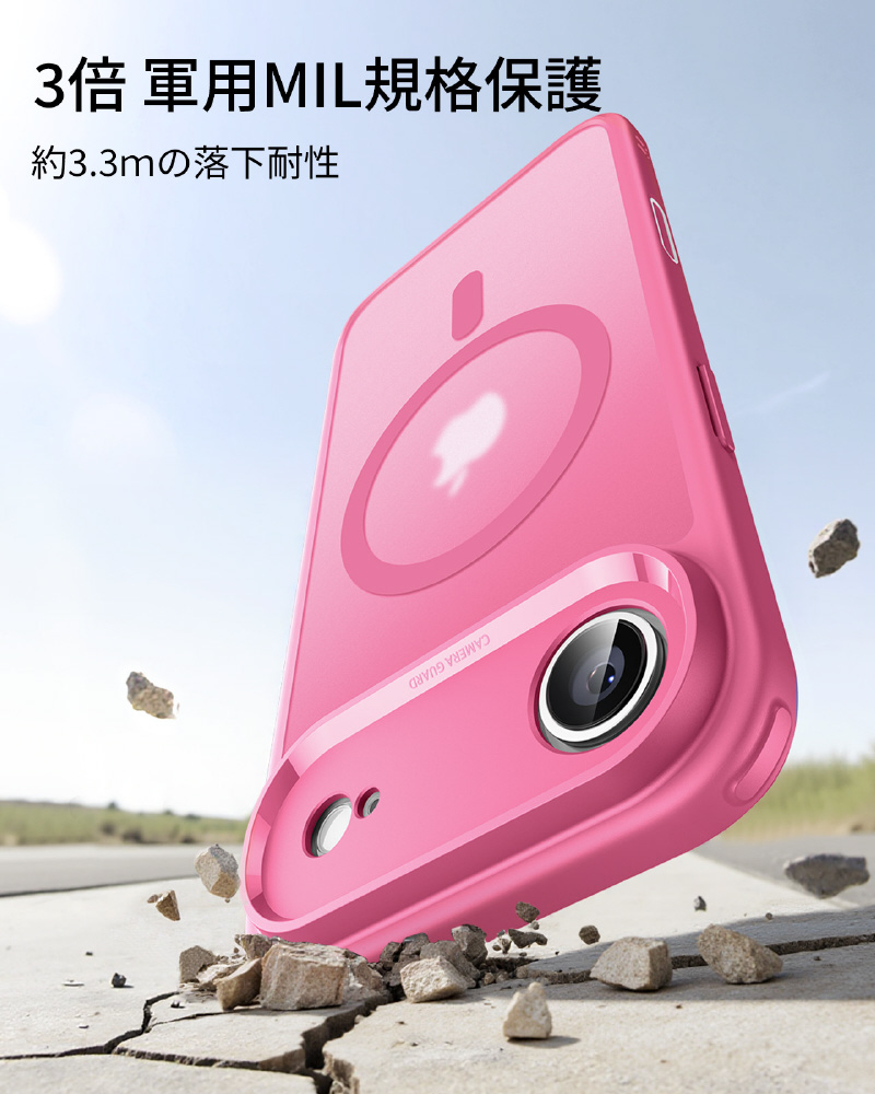 米軍規格MIL-STD-810Hの落下試験に合格したエアガードコーナー(認証番号:GZMR231203686802)を採用します。コンクリートへの高さ3.3メートル落下テストにも耐える設計で、駅のホームでの使用や登山中など、アクティブなシーンでも安心できます。うっかり落とした時も、大切なiPhoneを確実にプロテクトします
