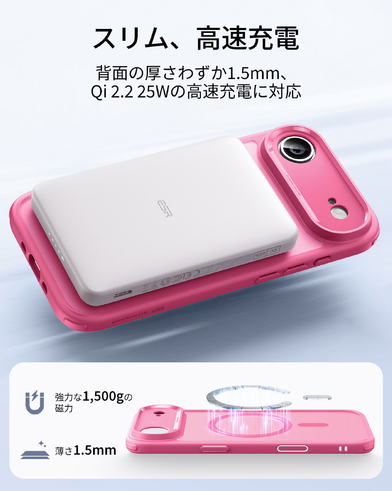 やアクセサリーが瞬時に「ピタッ」と吸着するため、満員電車や急いでいる時でも位置調整の手間が不要です。充電中のずれ落ちやアクセサリーの外れが心配ない設計で、移動中やアウトドアでの利便性が格段に向上します