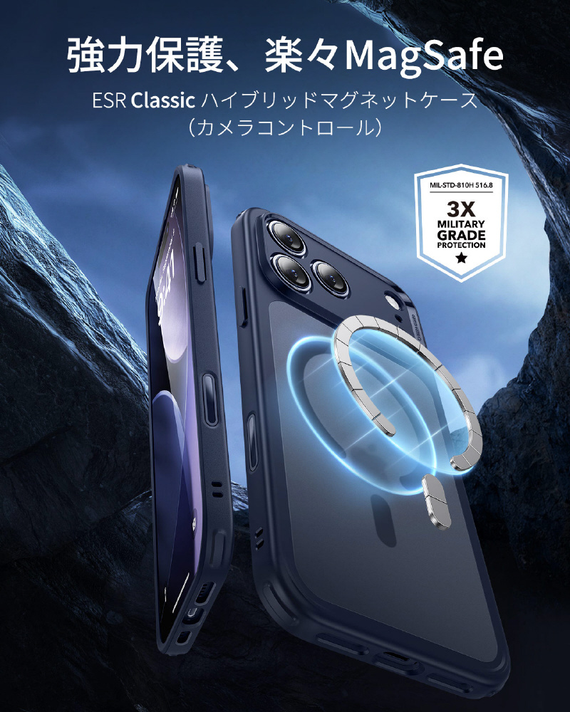 米軍規格MIL-STD-810Hの落下試験に合格したエアガードコーナー(認証番号:GZMR231203686802)を採用します。コンクリートへの高さ3.3メートル落下テストにも耐える設計で、駅のホームでの使用や登山中など、アクティブなシーンでも安心できます。うっかり落とした時も、大切なiPhoneを確実にプロテクトします