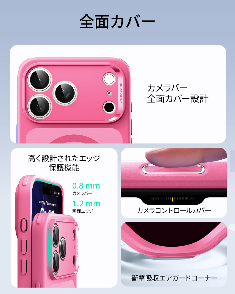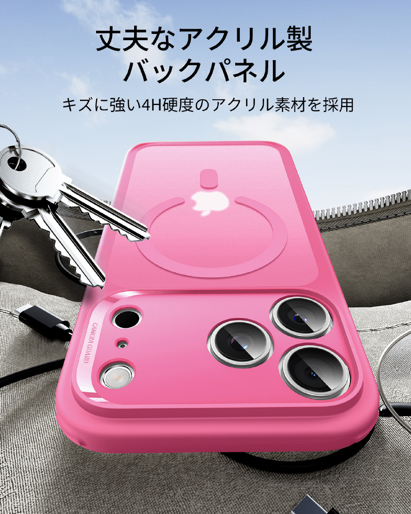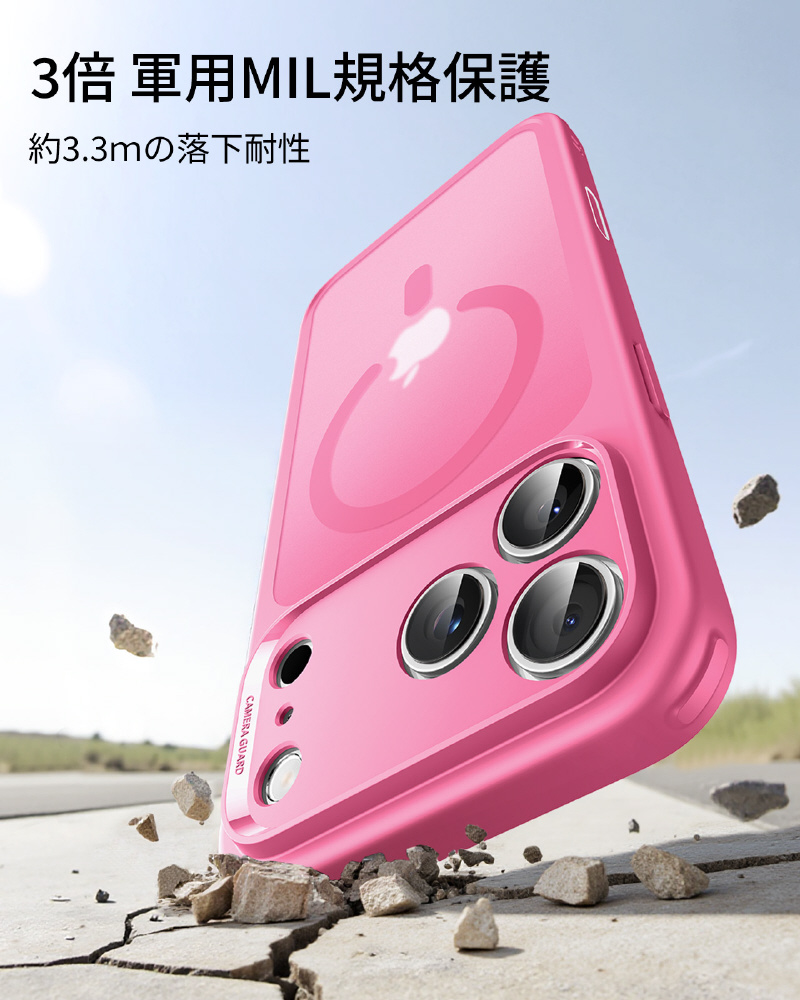 米軍規格MIL-STD-810Hの落下試験に合格したエアガードコーナー(認証番号:GZMR231203686802)を採用します。コンクリートへの高さ3.3メートル落下テストにも耐える設計で、駅のホームでの使用や登山中など、アクティブなシーンでも安心できます。うっかり落とした時も、大切なiPhoneを確実にプロテクトします