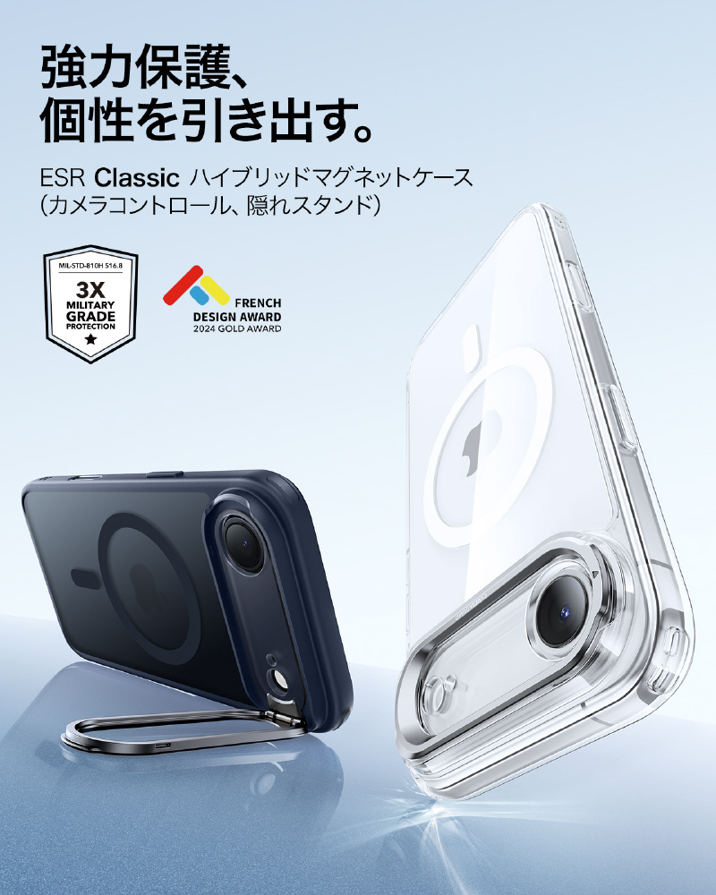 「スタンドケース、便利だけど邪魔じゃない?」いいえ、このスタンドは隠蔽式です!必要な時だけに出し、縦位置・横位置を自由自在に調整可能で、YouTube視聴はもちろん、TikTokやInstagramの縦長動画のライブ配信にも最適です。この独創的なデザインは、フレンチデザインアワード2024ゴールド賞を受賞しました!スタンドを使いながら同時にMagSafe充電もでき、革命的な便利さです
