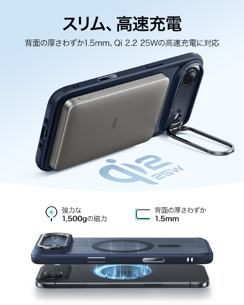 内蔵のN52M強力磁石と薄さ1.5mmのバックパネルが、最大25W充電対応の高速かつロスなしのMagSafe充電を実現します。さらに、このiPhoneケースは厳選素材と独自の抗黄変配方で、複合バックパネルと表面4H硬度処理により、長期間使用でも黄ばみやキズ(鍵やコインなども)に強く、いつまでも新品のような美しさを保ち続けます