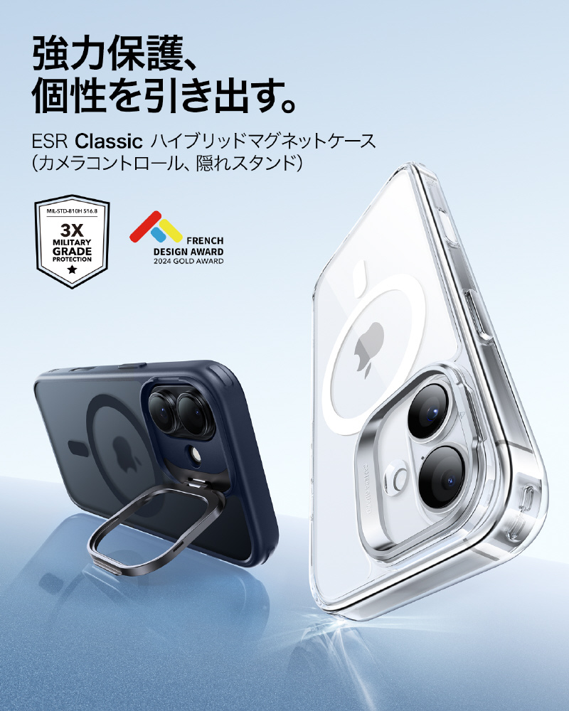 「スタンドケース、便利だけど邪魔じゃない?」いいえ、このスタンドは隠蔽式です!必要な時だけに出し、縦位置・横位置を自由自在に調整可能で、YouTube視聴はもちろん、TikTokやInstagramの縦長動画のライブ配信にも最適です。この独創的なデザインは、フレンチデザインアワード2024ゴールド賞を受賞しました!スタンドを使いながら同時にMagSafe充電もでき、革命的な便利さです