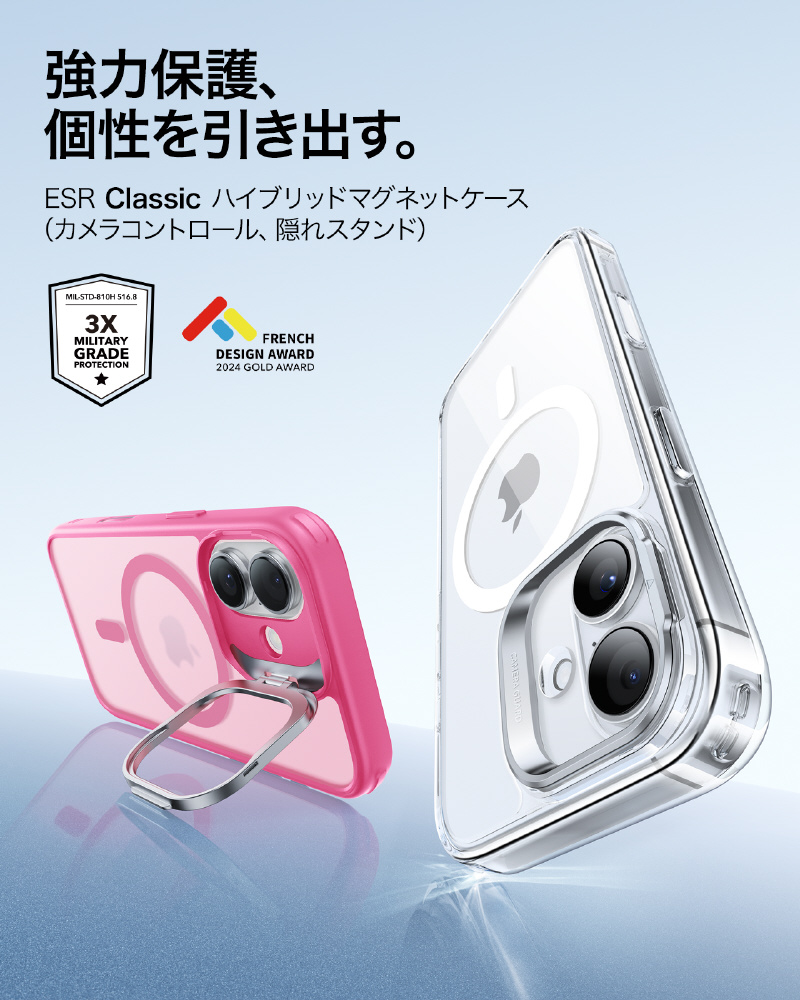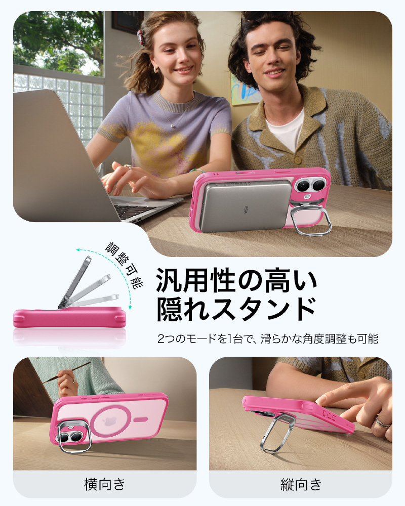 「スタンドケース、便利だけど邪魔じゃない?」いいえ、このスタンドは隠蔽式です!必要な時だけに出し、縦位置・横位置を自由自在に調整可能で、YouTube視聴はもちろん、TikTokやInstagramの縦長動画のライブ配信にも最適です。この独創的なデザインは、フレンチデザインアワード2024ゴールド賞を受賞しました!スタンドを使いながら同時にMagSafe充電もでき、革命的な便利さです