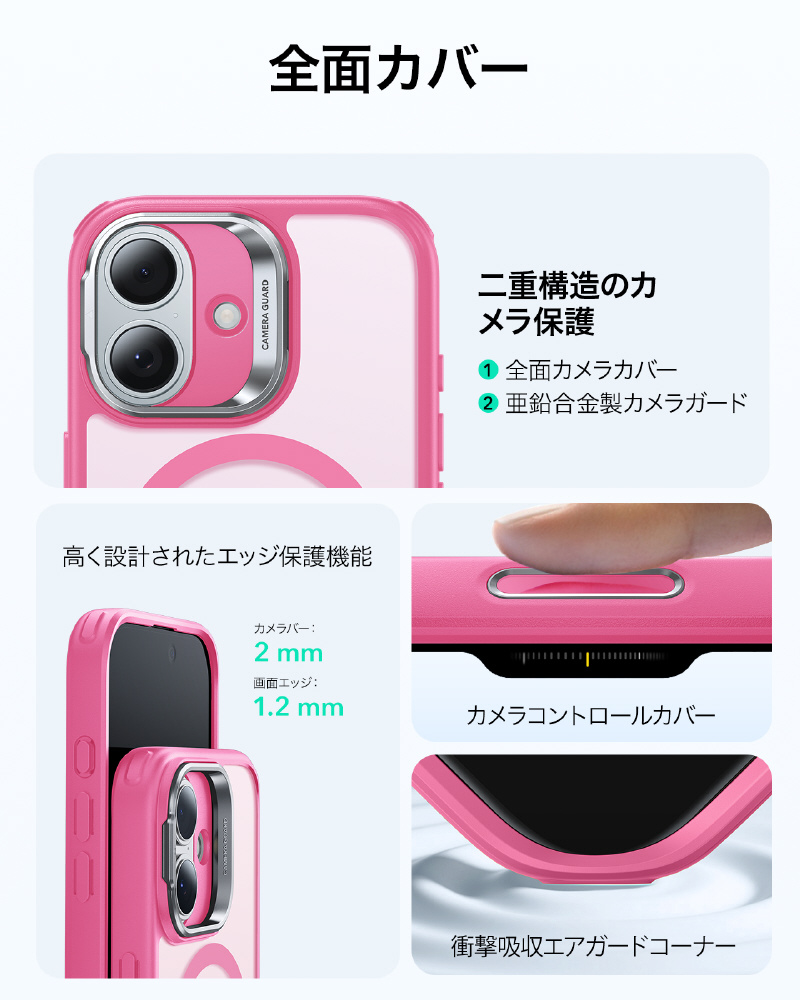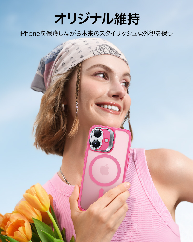 カメラレンズはスマホの命です!このiPhone17ケースはレンズ全体を覆うフルカバーと、丈夫な亜鉛合金製スタンドの二段構えで傷から徹底保護します。さらに周辺部よりわずかに高く設計されているため、置くときや落とした時の擦り傷やキズからもレンズを守ります。機能性と美しい一体感を実現したデザインです