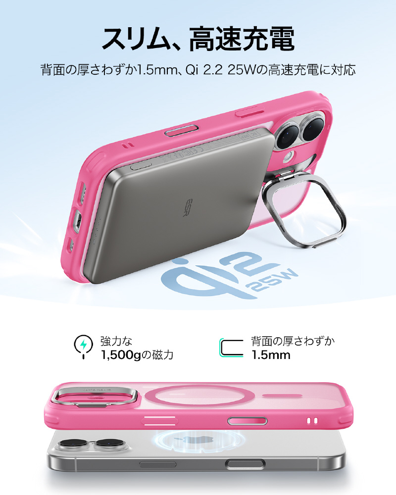 内蔵のN52M強力磁石と薄さ1.5mmのバックパネルが、最大25W充電対応の高速かつロスなしのMagSafe充電を実現します。さらに、このiPhone17ケースは厳選素材と独自の抗黄変配方で、複合バックパネルと表面4H硬度処理により、長期間使用でも黄ばみやキズ(鍵やコインなども)に強く、いつまでも新品のような美しさを保ち続けます