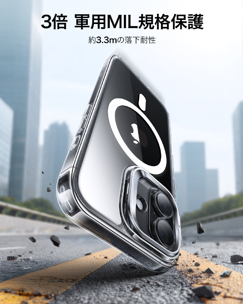 iPhone 17 (6.3インチ)MagSafe対応、隠れスタンド付き、ミリタリーグレードケース クリア 1A86500101-Clear