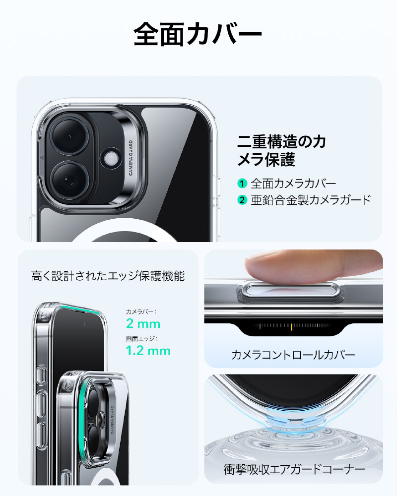 カメラレンズはスマホの命です!このiPhone17ケースはレンズ全体を覆うフルカバーと、丈夫な亜鉛合金製スタンドの二段構えで傷から徹底保護します。さらに周辺部よりわずかに高く設計されているため、置くときや落とした時の擦り傷やキズからもレンズを守ります。機能性と美しい一体感を実現したデザインです
