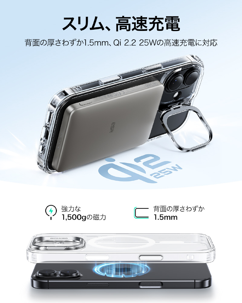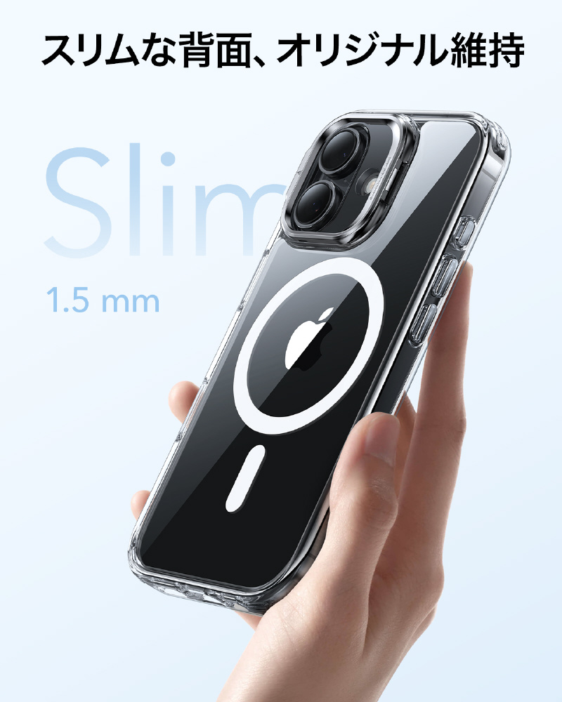 内蔵のN52M強力磁石と薄さ1.5mmのバックパネルが、最大25W充電対応の高速かつロスなしのMagSafe充電を実現します。さらに、このiPhone17ケースは厳選素材と独自の抗黄変配方で、複合バックパネルと表面4H硬度処理により、長期間使用でも黄ばみやキズ(鍵やコインなども)に強く、いつまでも新品のような美しさを保ち続けます