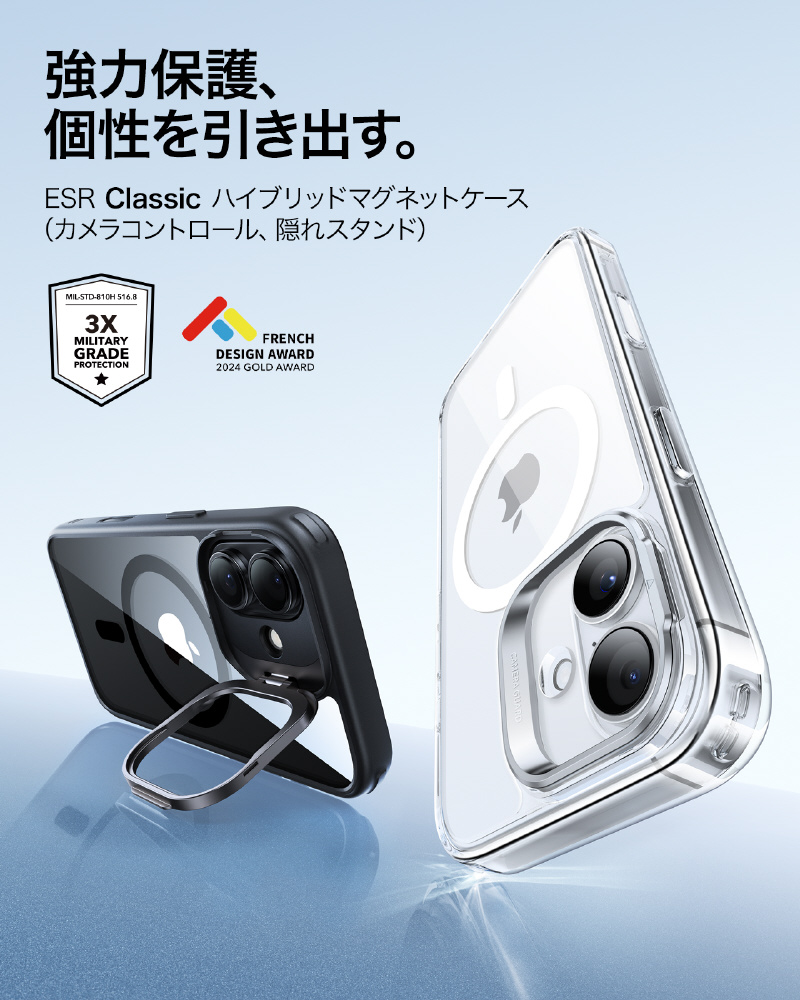 「スタンドケース、便利だけど邪魔じゃない?」いいえ、このスタンドは隠蔽式です!必要な時だけに出し、縦位置・横位置を自由自在に調整可能で、YouTube視聴はもちろん、TikTokやInstagramの縦長動画のライブ配信にも最適です。この独創的なデザインは、フレンチデザインアワード2024ゴールド賞を受賞しました!スタンドを使いながら同時にMagSafe充電もでき、革命的な便利さです
