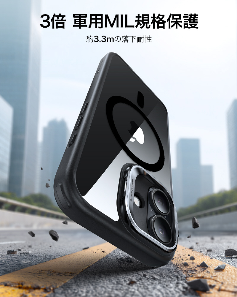 iPhone 17 (6.3インチ)MagSafe対応、隠れスタンド付き、ミリタリーグレードケース クリアブラック 1A86500301-Clear Black