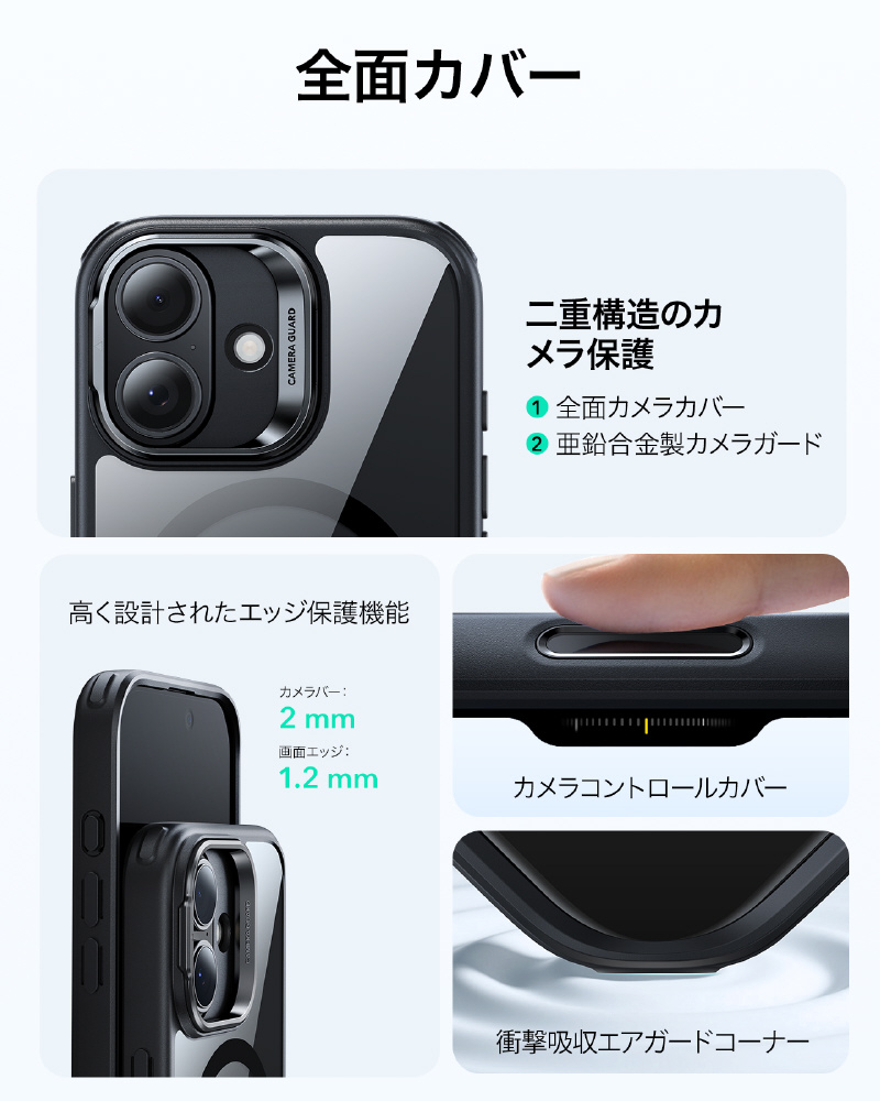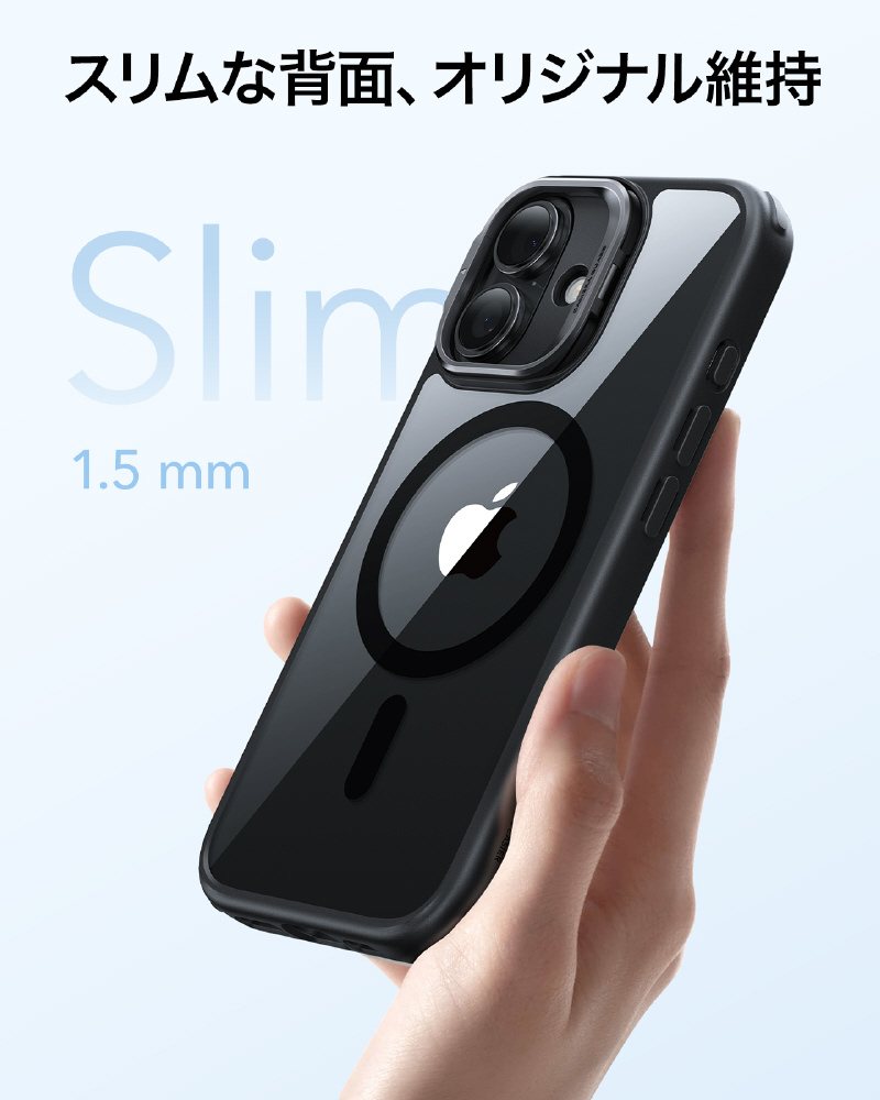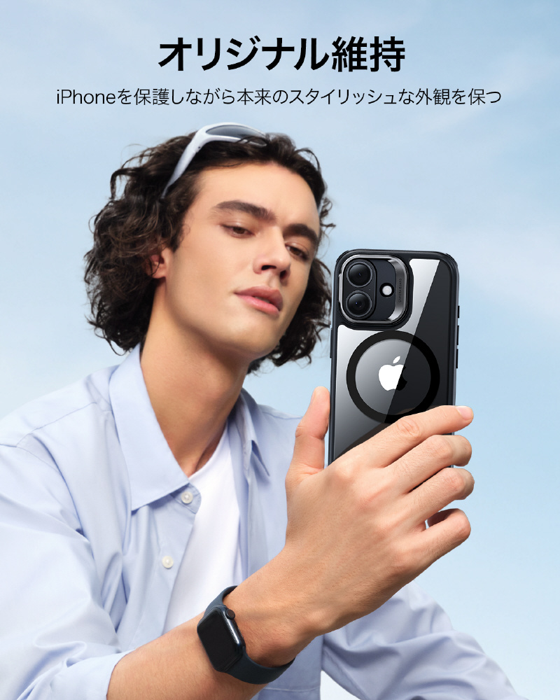カメラレンズはスマホの命です!このiPhone17ケースはレンズ全体を覆うフルカバーと、丈夫な亜鉛合金製スタンドの二段構えで傷から徹底保護します。さらに周辺部よりわずかに高く設計されているため、置くときや落とした時の擦り傷やキズからもレンズを守ります。機能性と美しい一体感を実現したデザインです
