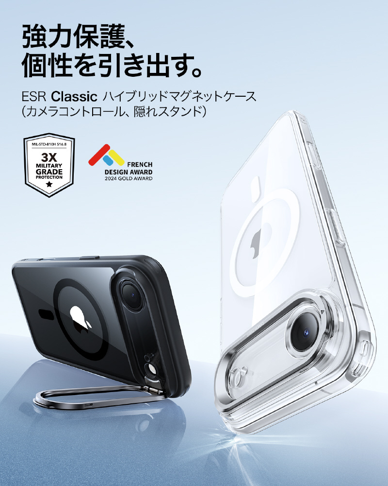 「スタンドケース、便利だけど邪魔じゃない?」いいえ、このスタンドは隠蔽式です!必要な時だけに出し、縦位置・横位置を自由自在に調整可能で、YouTube視聴はもちろん、TikTokやInstagramの縦長動画のライブ配信にも最適です。この独創的なデザインは、フレンチデザインアワード2024ゴールド賞を受賞しました!スタンドを使いながら同時にMagSafe充電もでき、革命的な便利さです