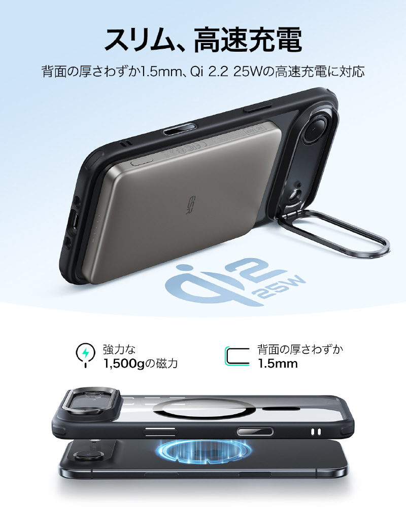 内蔵のN52M強力磁石と薄さ1.5mmのバックパネルが、最大25W充電対応の高速かつロスなしのMagSafe充電を実現します。さらに、このiPhoneケースは厳選素材と独自の抗黄変配方で、複合バックパネルと表面4H硬度処理により、長期間使用でも黄ばみやキズ(鍵やコインなども)に強く、いつまでも新品のような美しさを保ち続けます