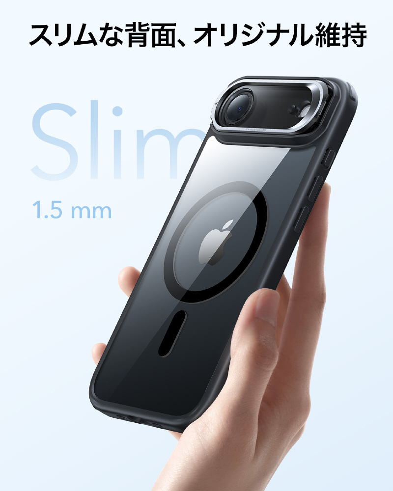 カメラレンズはスマホの命です!このiPhone17ケースはレンズ全体を覆うフルカバーと、丈夫な亜鉛合金製スタンドの二段構えで傷から徹底保護します。さらに周辺部よりわずかに高く設計されているため、置くときや落とした時の擦り傷やキズからもレンズを守ります。機能性と美しい一体感を実現したデザインです