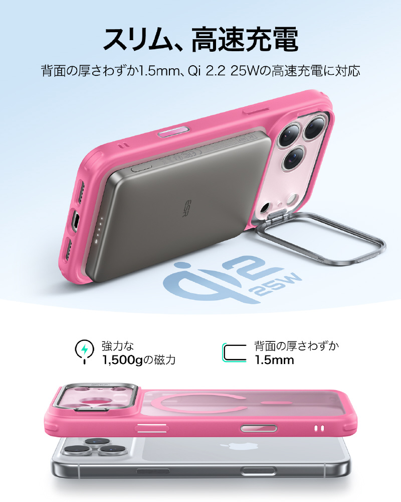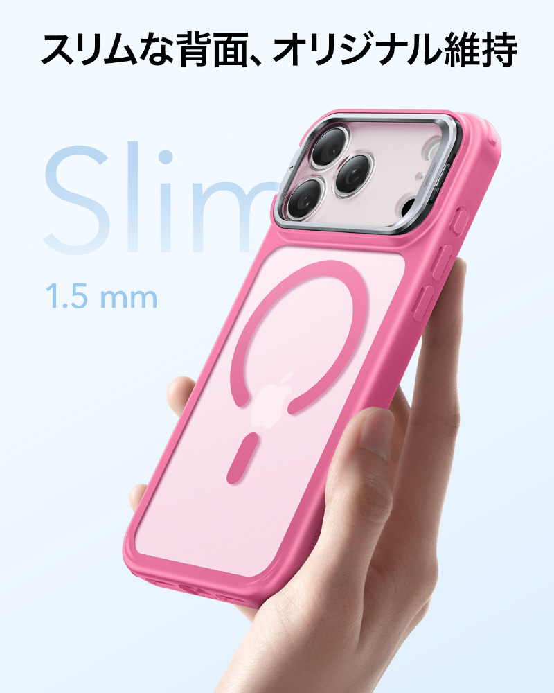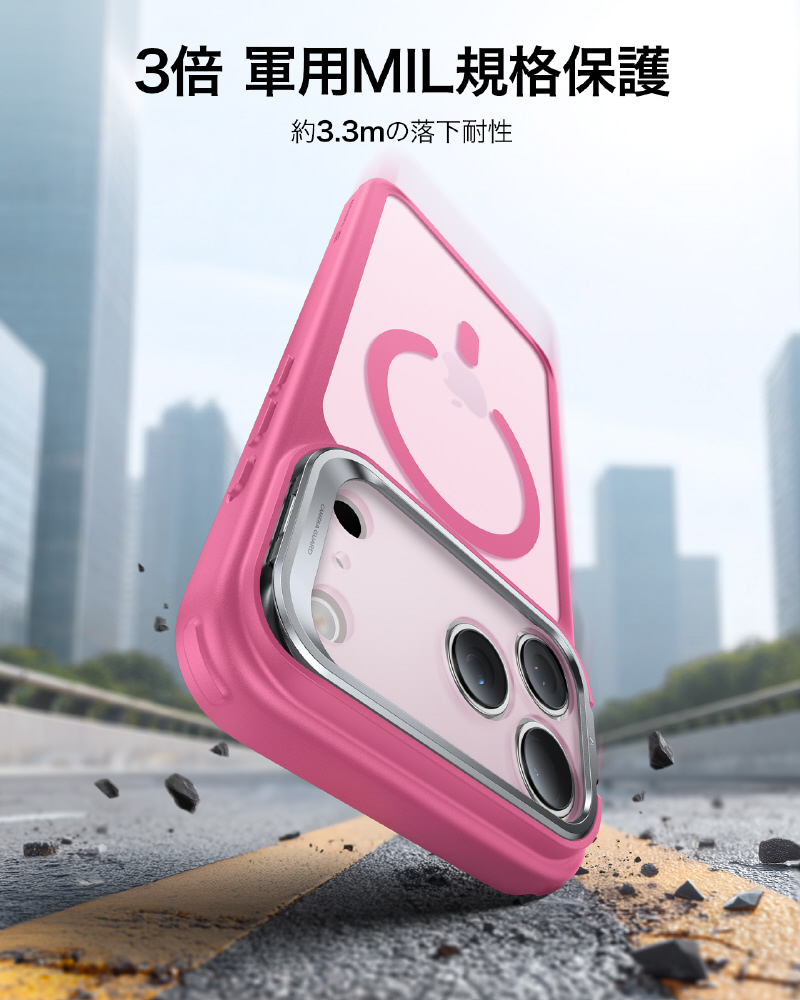 iPhone 17 Pro Max(6.9インチ)MagSafe対応、隠れスタンド付き、ミリタリーグレードケース フロストピンク 1A86800501-Frosted Pink