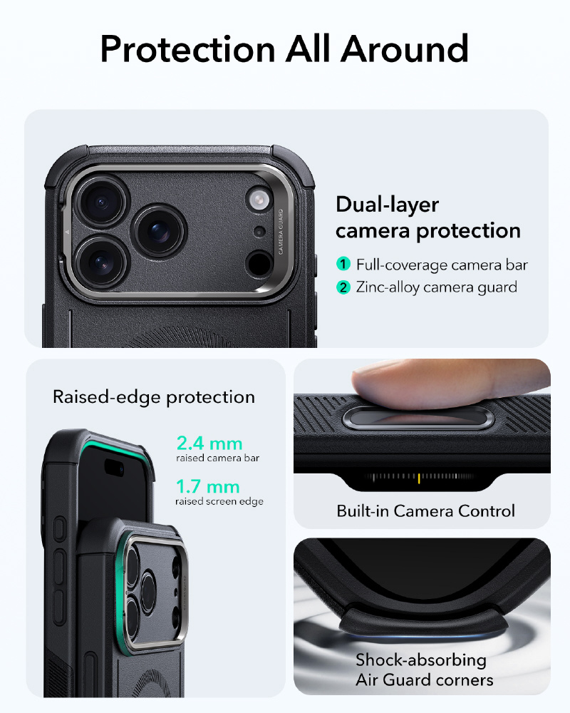 革新的なカメラコントロールボタンを専用カバーで守りながら、指先に伝わるプロ級の操作感をそのまま体感できます。スライド時の滑らかな動きから押圧時の確かな反発感まで、本体と遜色ない精密なタッチレスポンスを実現します。ボタン周辺の隙間を完全に封鎖する設計で、ほこり侵入を徹底シャットアウトします。精密センサーを埃のストレスから守り、シャッターチャンスを逃さない快適操作を長く支えます