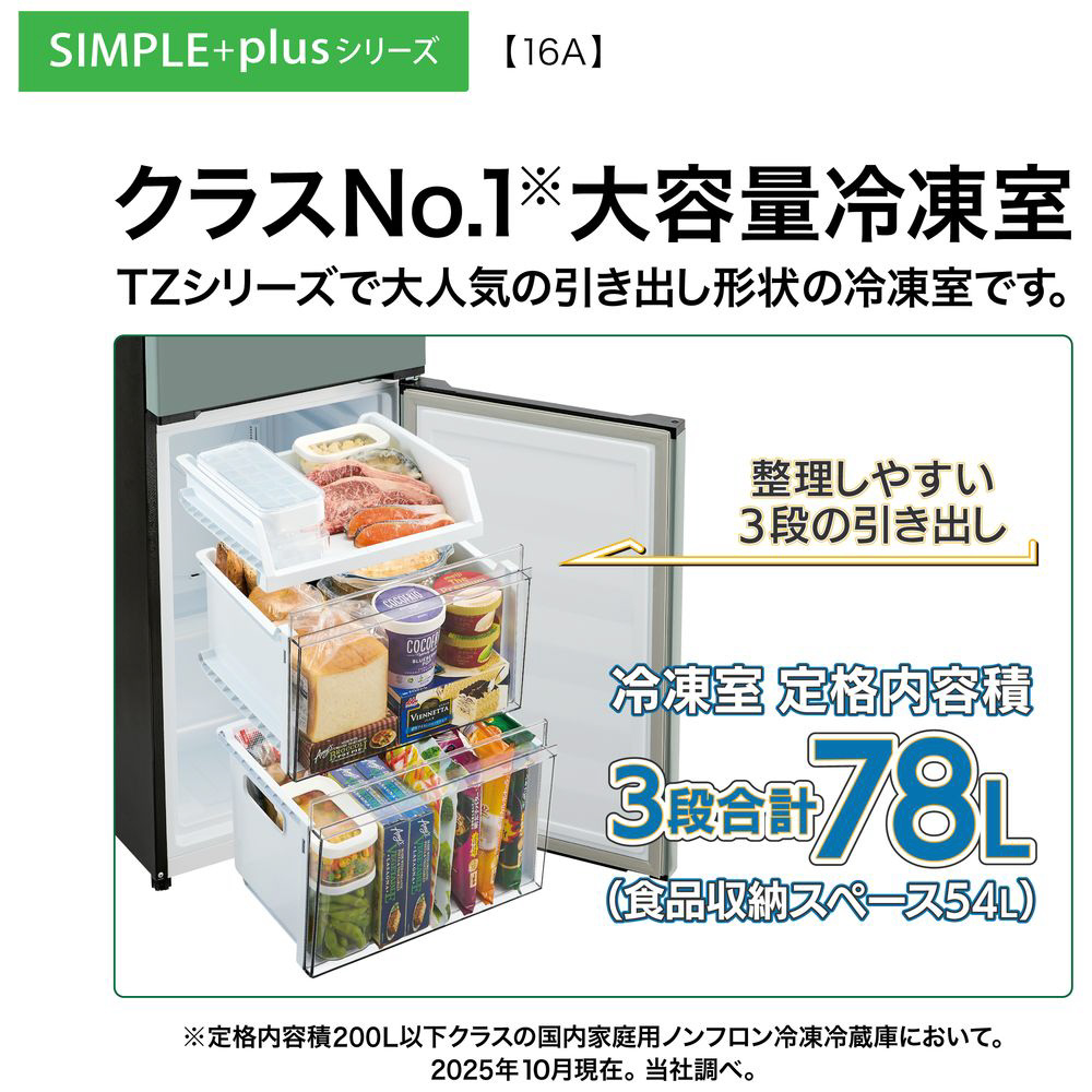 TZシリーズで大人気の引き出し形状の冷凍室です。整理しやすい3段の引き出しで、冷凍室の定格内容積は3段合計78L(食品収納スペース54L)。