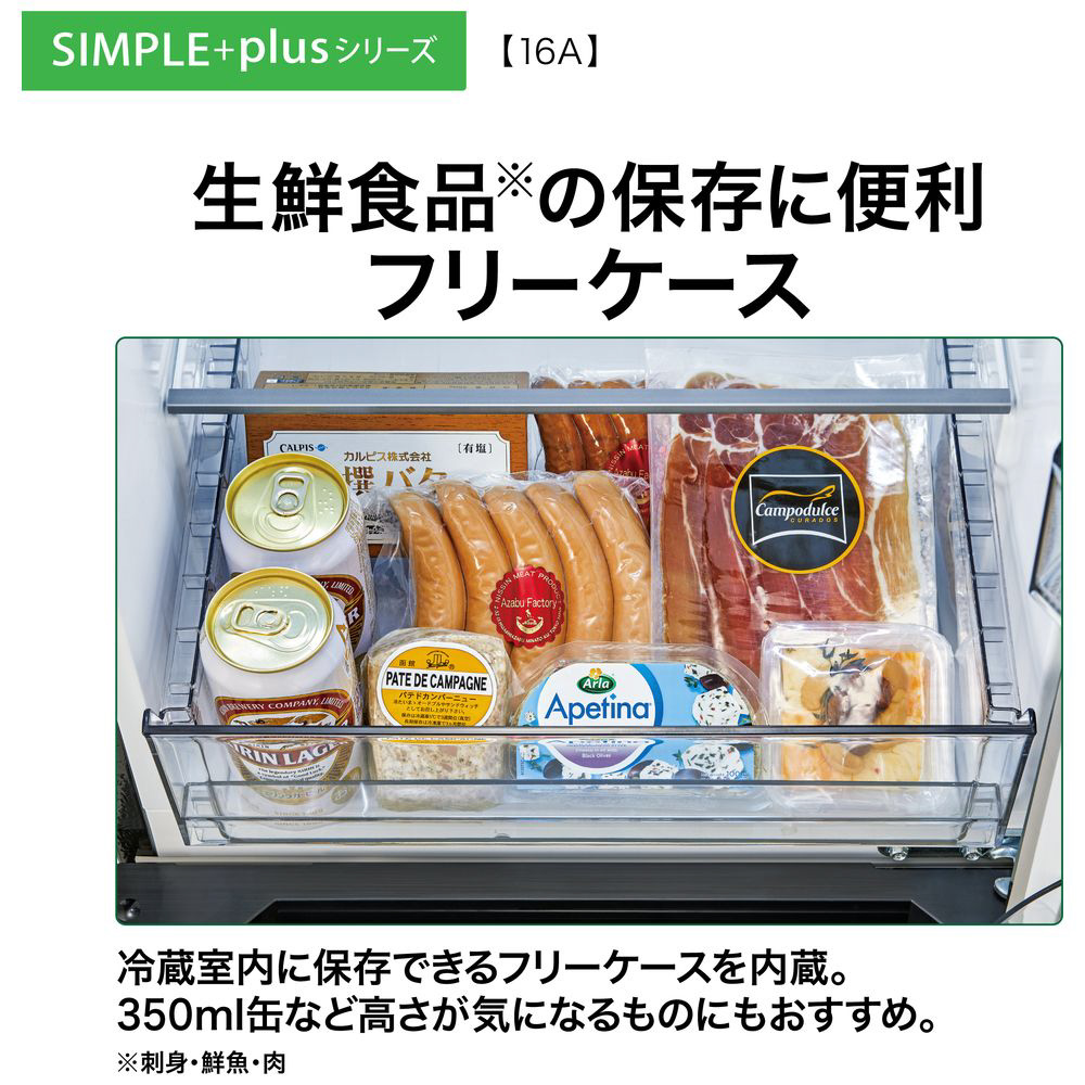 冷蔵室内に保存できるフリーケースを内蔵。350ml缶など高さが気になるものにおすすめ。