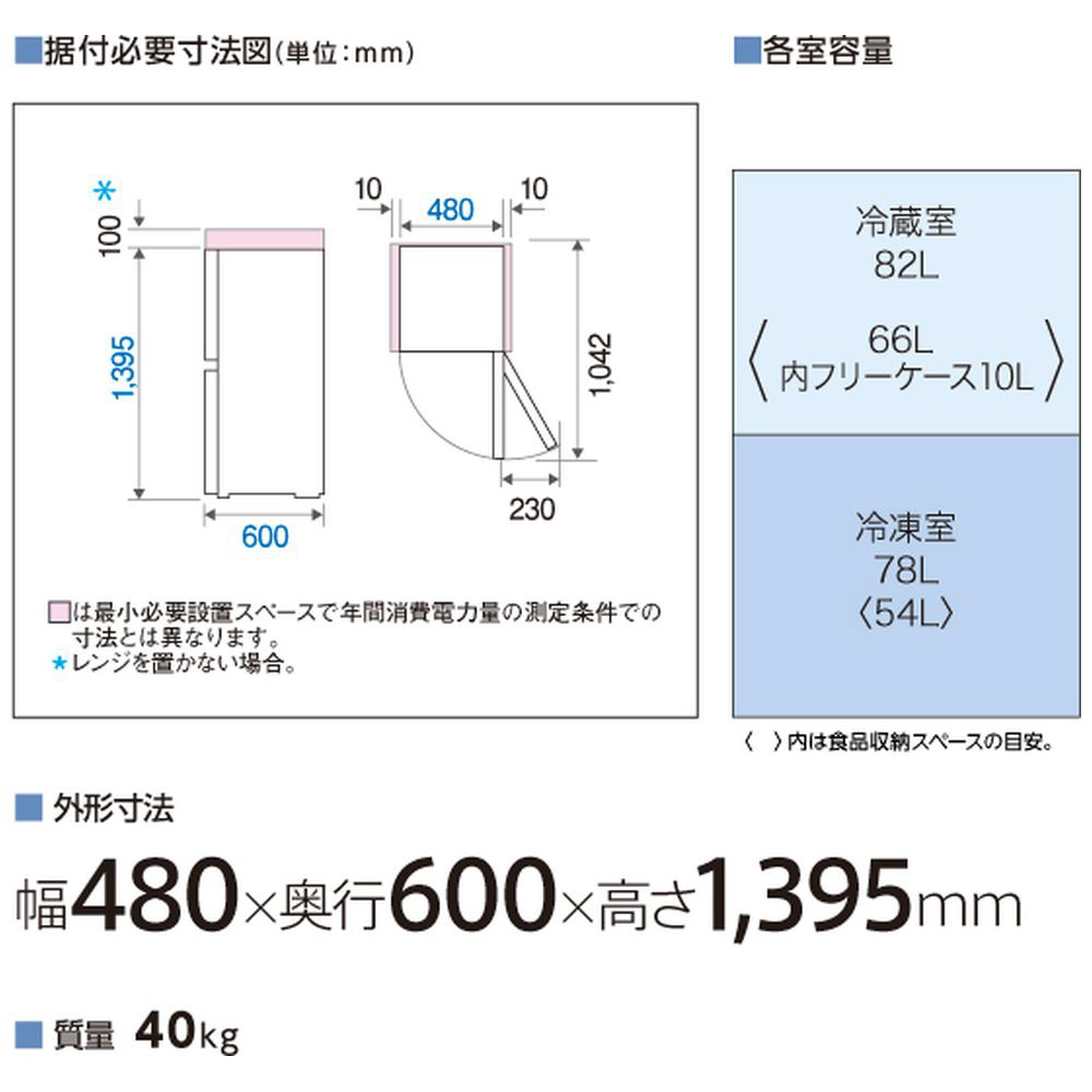 食品収納スペースの目安 ・冷蔵室: <66L> ・内フリーケース: <10L> ・冷凍室: <54L>