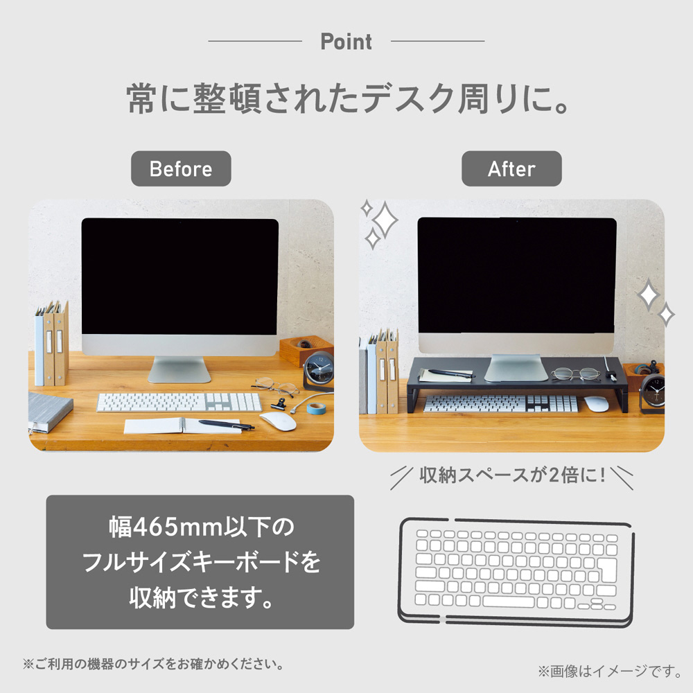 モニター台・PCスタンドとして人気の机上台に、フルサイズキーボードがぴったり収まる新サイズ<幅495mm>が新登場!幅465mm以下のキーボードが収納可能です。