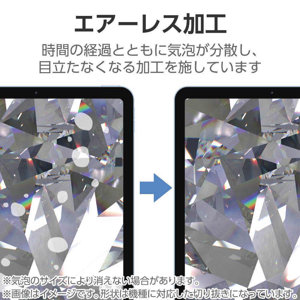 貼る際に気泡が入りにくく、入った場合でも時間の経過とともに気泡が分散され目立たなくなります。また、小さなホコリ等を吸収し画面に気泡が残りません。