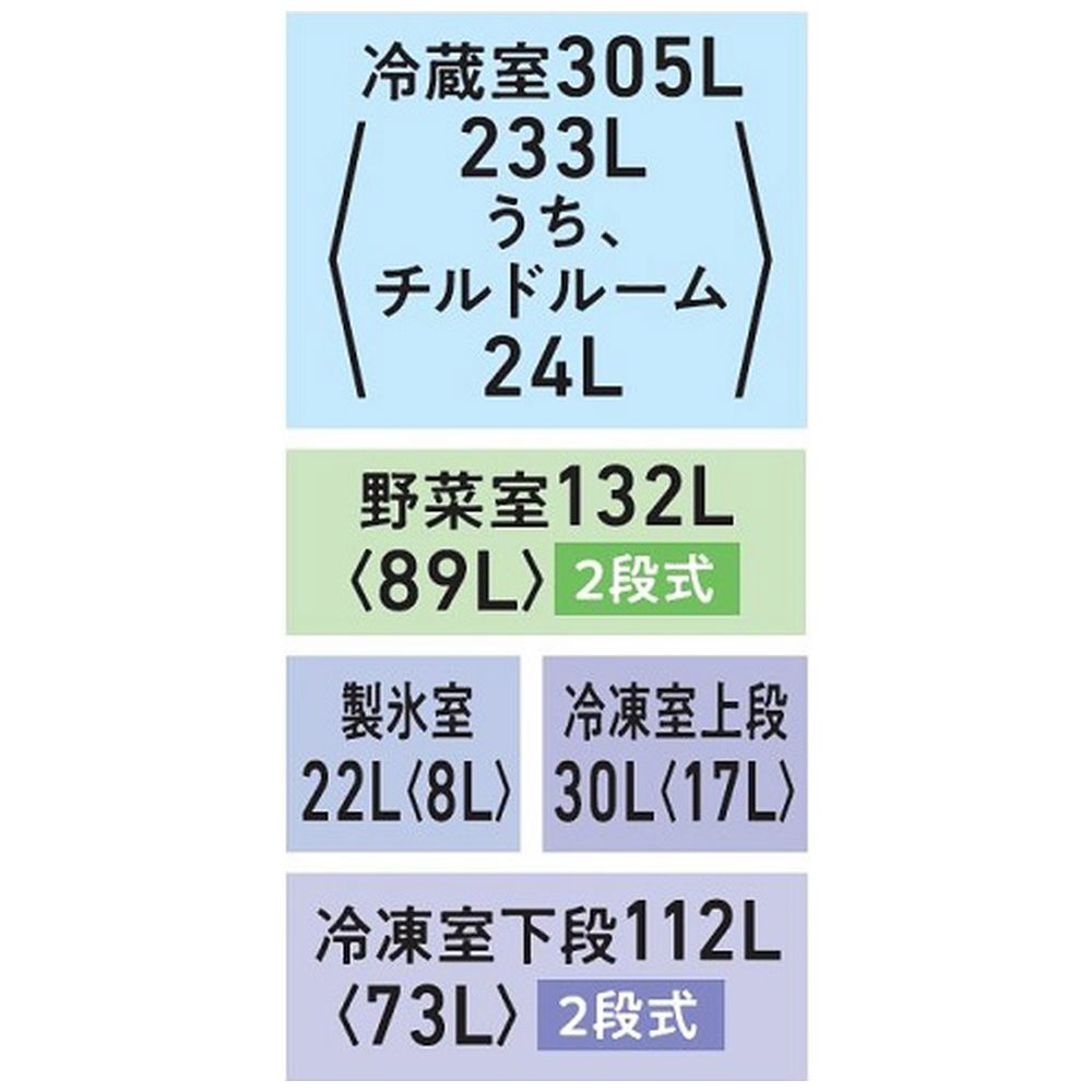 食品収納スペースの目安 ・冷蔵室: <233L> ・うち、チルドルーム: <24L> ・野菜室: <89L> ・製氷室: <8L> ・冷凍室上段: <17L> ・冷凍室下段: <73L>