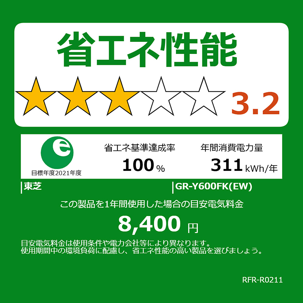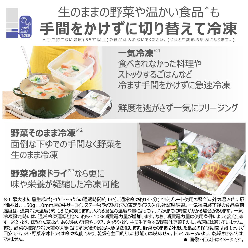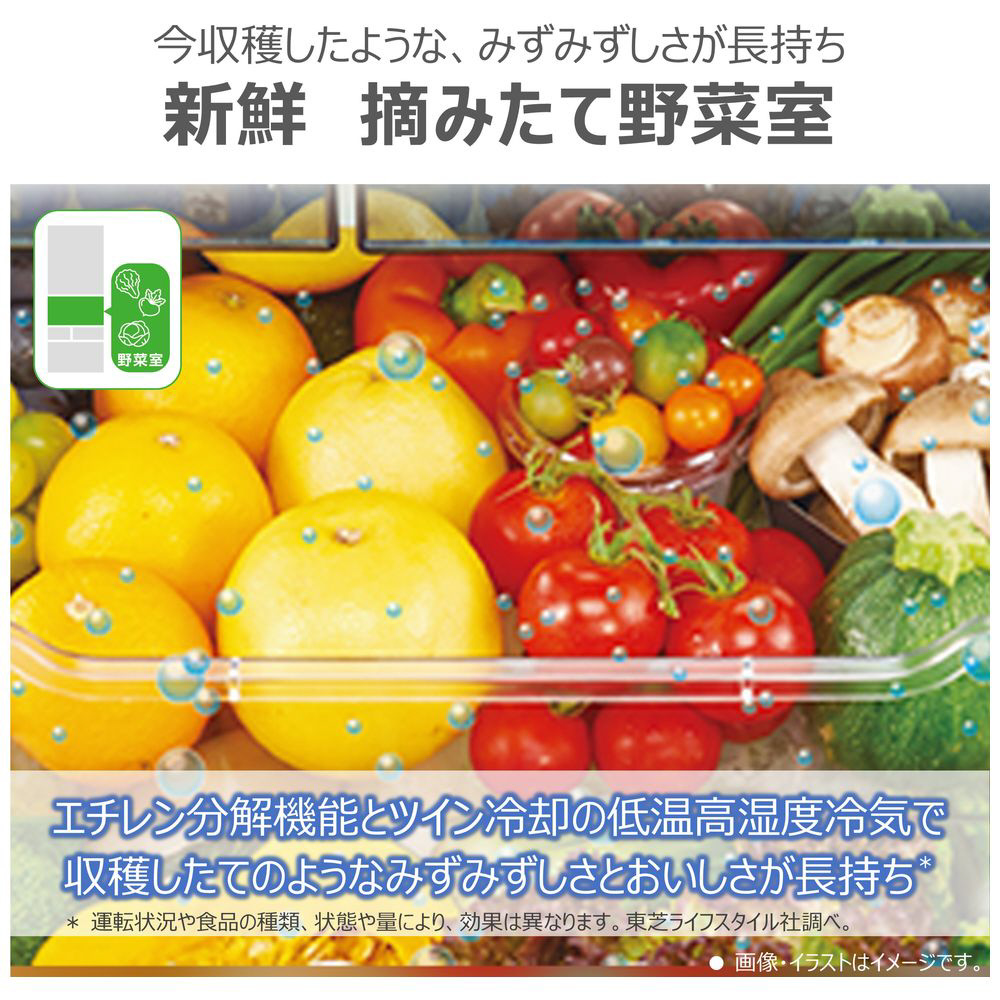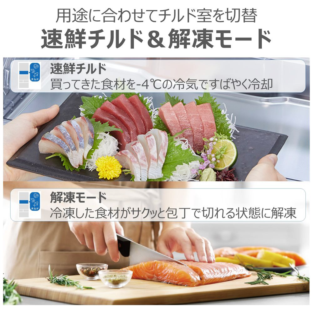 大容量&基本機能を搭載したスタンダードモデル。高まる省エネ意識へ対応「とってもにエコ」搭載。まんなかにレイアウトされた野菜室だから、重い野菜などの出し入れもスムーズにできます。