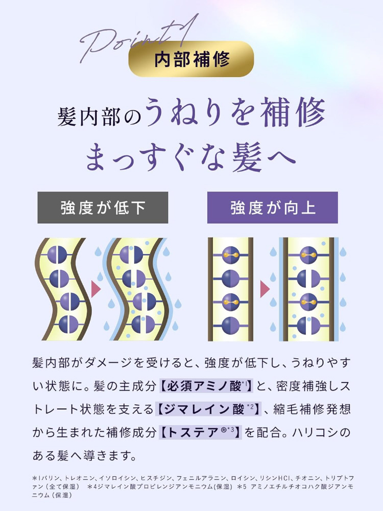 傷んだ髪にしっかり届く、高補修トリートメント。髪の内部まで栄養を届けて密着・補修し、うるおいとツヤをしっかりチャージ。まとまりのあるしなやかなストレート髪*へ。