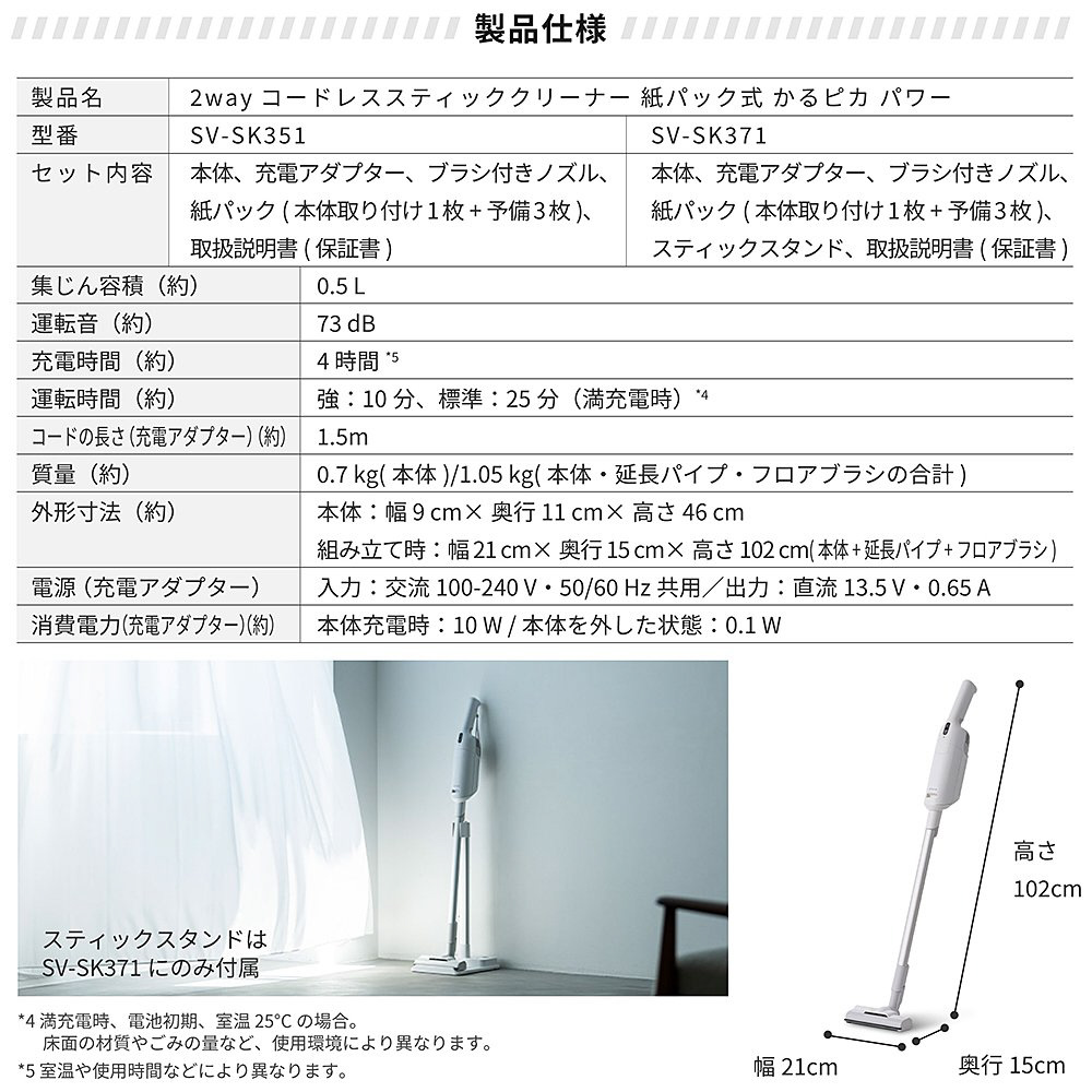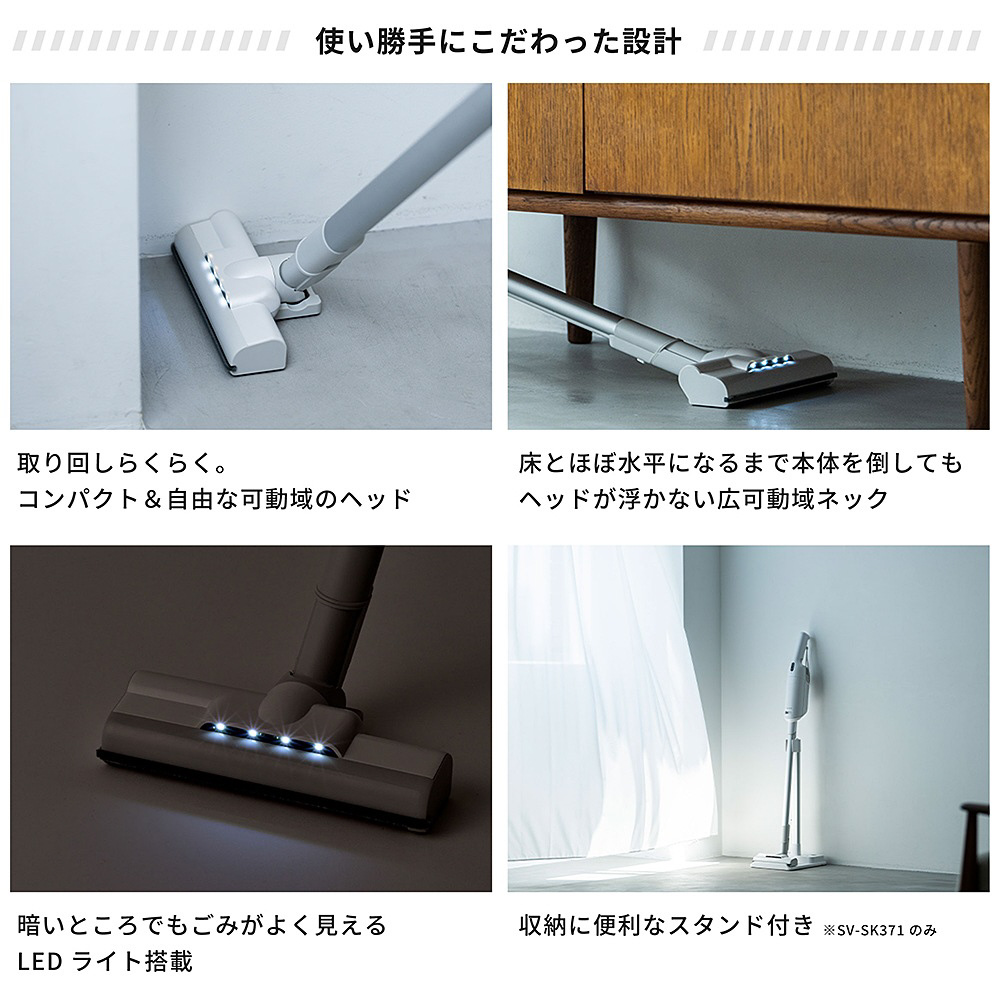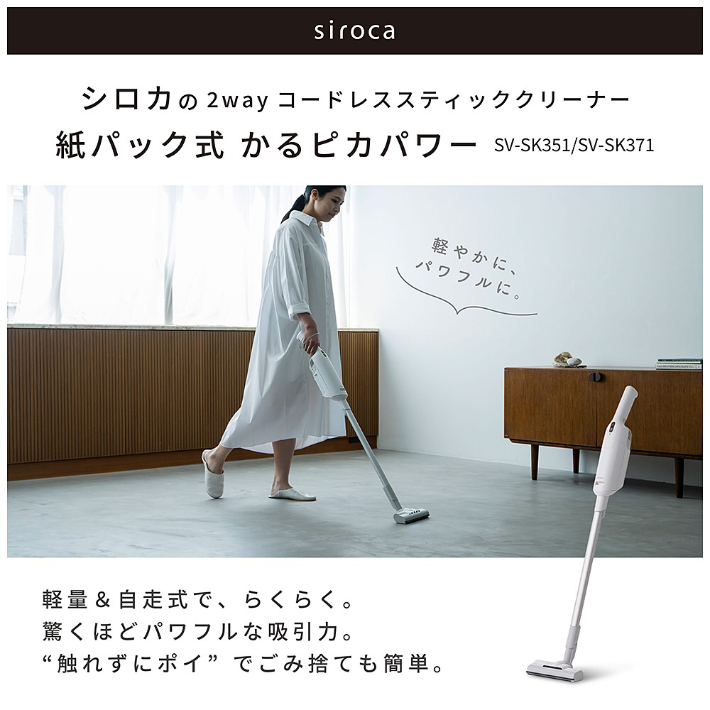 紙パック式コードレススティッククリーナー かるピカパワー siroca ホワイト SV-SK371 [紙パック式 /コードレス /水拭き非対応]