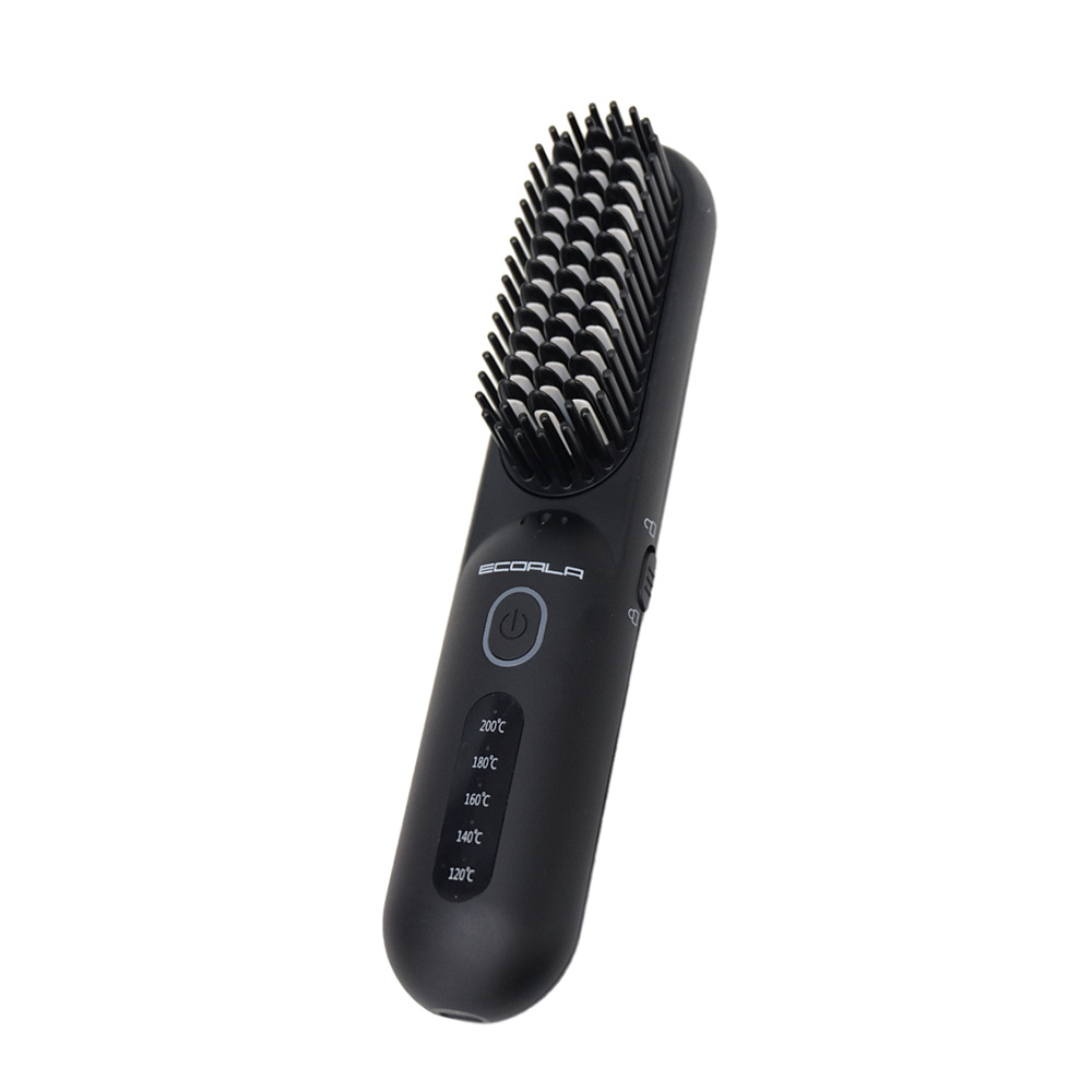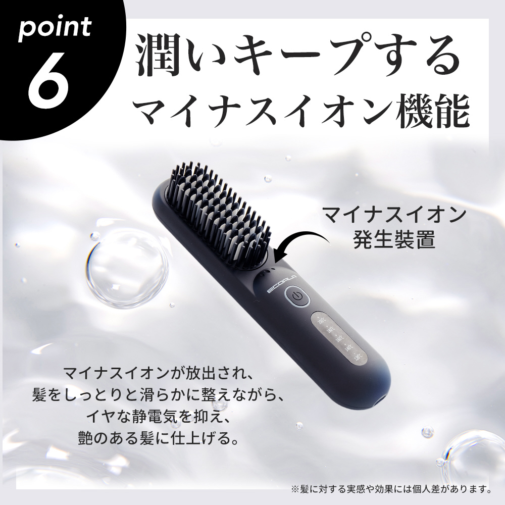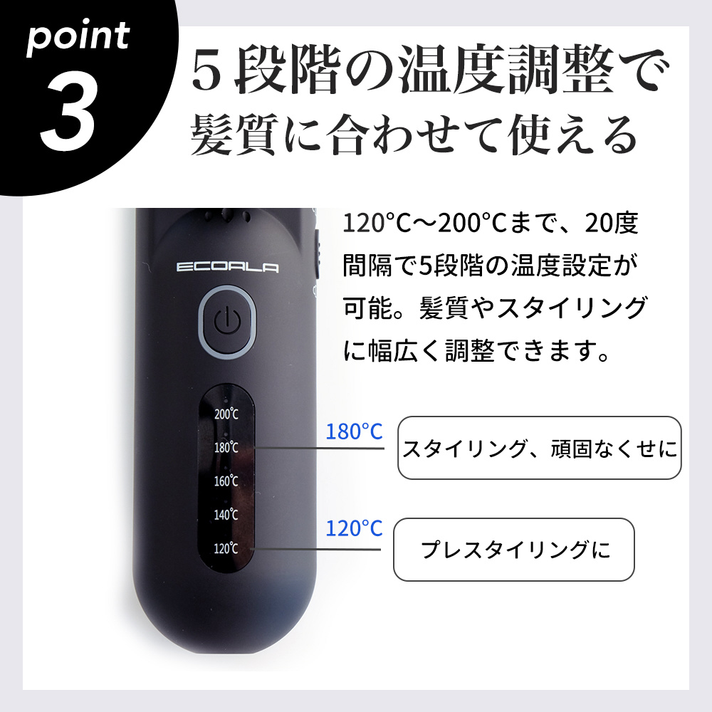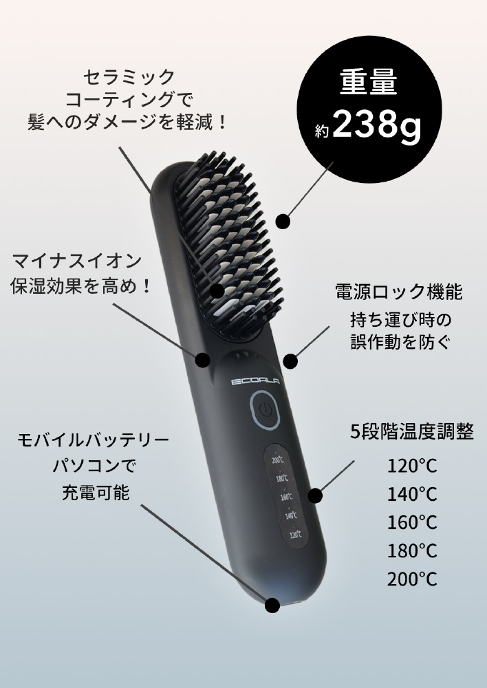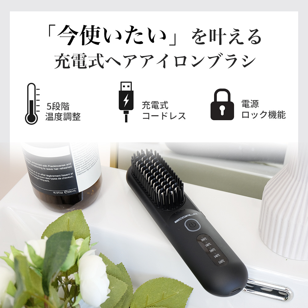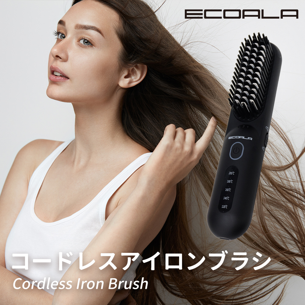 ECOALA コードレスアイロンブラシ l 美容師監修 l 持ち運び可能な充電式 l 温度調節5段階 l セラミックコーティング・マイナスイオン機能 l 軽量238g l ロック機能付