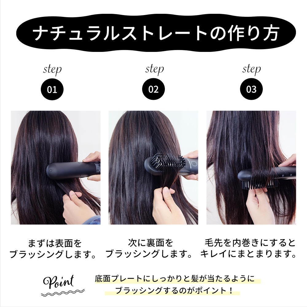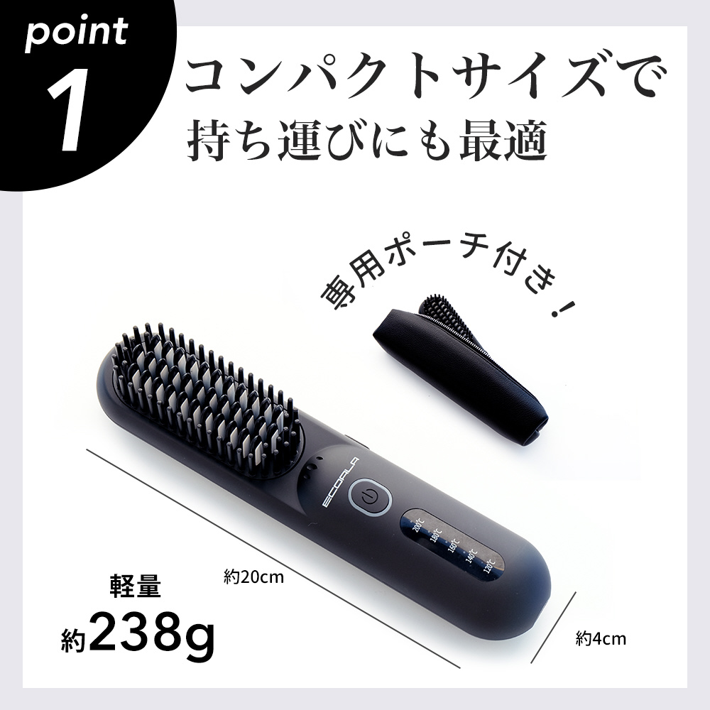 とかすだけで簡単ストレート!ブラシ型アイロン。忙しい朝、外出先でもとかすだけで、寝ぐせもクセも一瞬でリセット。充電式&ポーチ付きコンパクトに持ち運び可能。いつでも、どこでも、理想のスタイルが思いのまま。120℃〜200℃の5段階温度調整は、ナチュラルストレート、前髪直し、トップのボリュームアップも自由自在。。マットな質感、黒と白で統一されたスタイリッシュなデザイン
