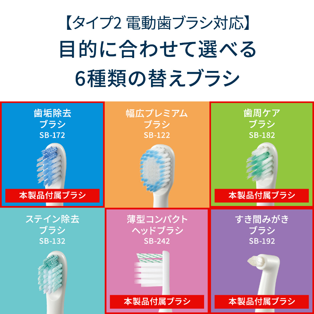 対応替えブラシについて歯垢除去ブラシ(2本)、SB-172幅広プレミアムブラシ(2本)、SB-122歯周ケアブラシ(2本)、SB-182ステイン除去ブラシ(2本)、SB-132すき間みがきブラシ(2本)、SB-192薄型コンパクトヘッドブラシ(2本)、SB-242ご購入の際は必ずタイプをご確認いただき、タイプ2の替えブラシをご利用ください。異なるタイプでは使用できません。