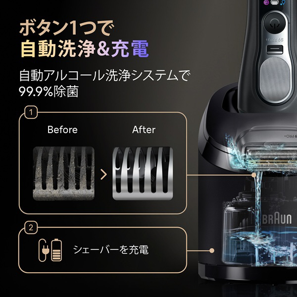5 in 1 自動アルコール洗浄システムは、ボタン1つで洗浄、乾燥、充電を行い、ブラウン独自のアルコール配合で99.9%の細菌を除去します。