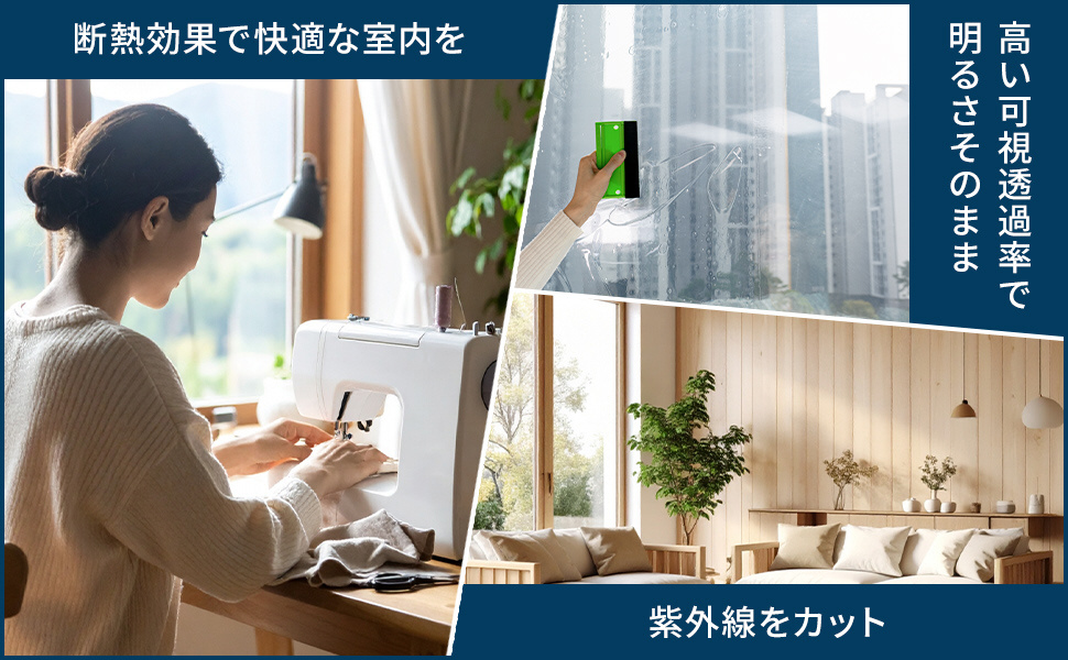 高い透過率(75.9%)で、自然光をやわらかく取り入れながら、快適な視界と室内環境を実現します。紫外線も99.7%カットされるため、肌への影響や家具・床材の色あせ対策にも効果的。ソーイングや読書、デスクワークなど、自然光を生かした空間づくりにぴったりです。視界を妨げず、暮らしの質を高めたい方におすすめのフィルムです。