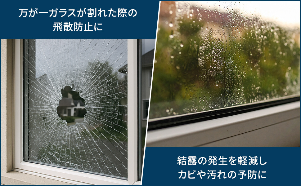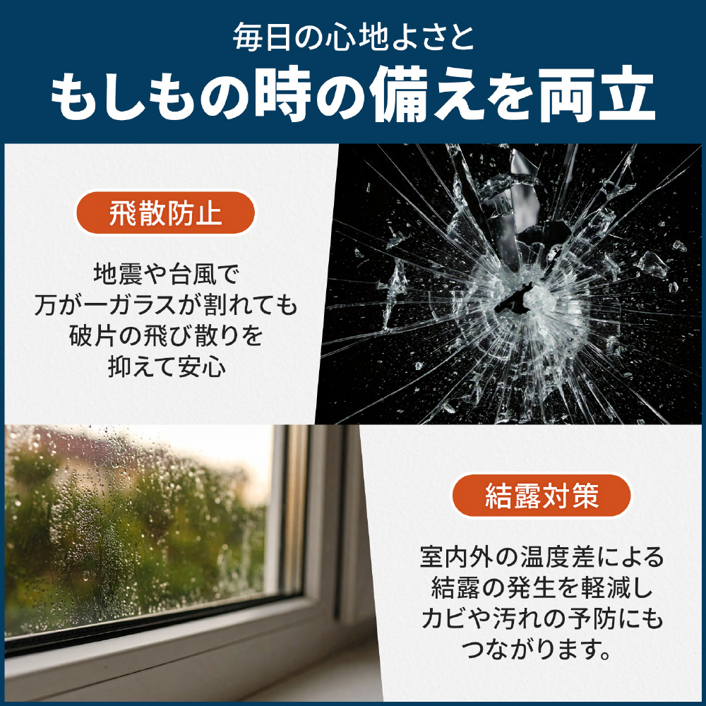 突然の衝撃でガラスが割れても、破片の飛び散りを抑える構造で安心感アップ。地震や台風など万が一の備えとしても役立ちます。普段は見えない安全対策として、目立たないけれど頼れる一枚です。