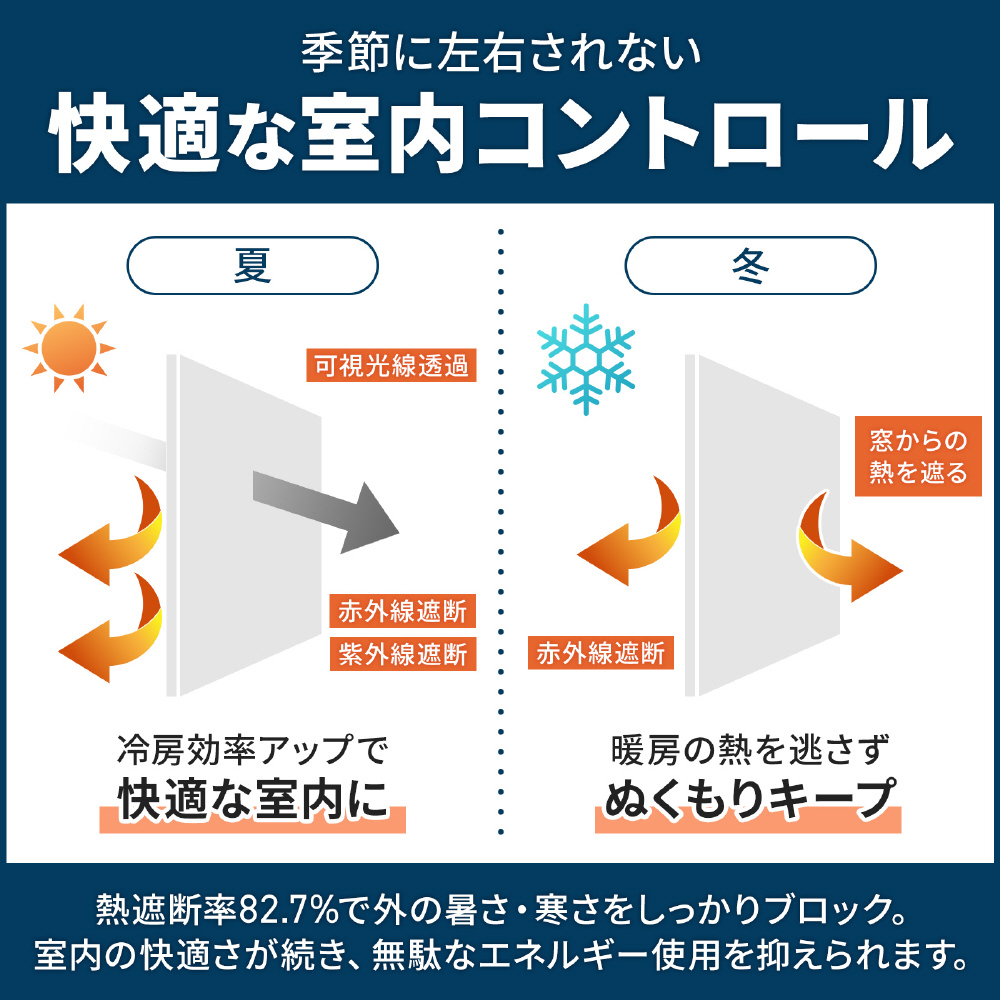 夏は最大6℃涼しく、冬は最大5℃あたたかく。窓に貼るだけで、冷暖房効率をサポートする断熱シートです。冷たい空気や熱気の出入りを抑え、年間を通して快適な室内空間に。季節の変化に左右されず、過ごしやすさをしっかりキープできます。