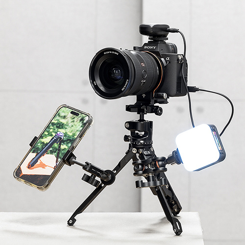脚部には複数の補助光やスマホを取り付け可能。高さ調整もできるから、デスクトップ撮影や自撮りにも最適。省スペースで多彩な撮影をサポートし、あなたの撮影空間をスッキリ整理。