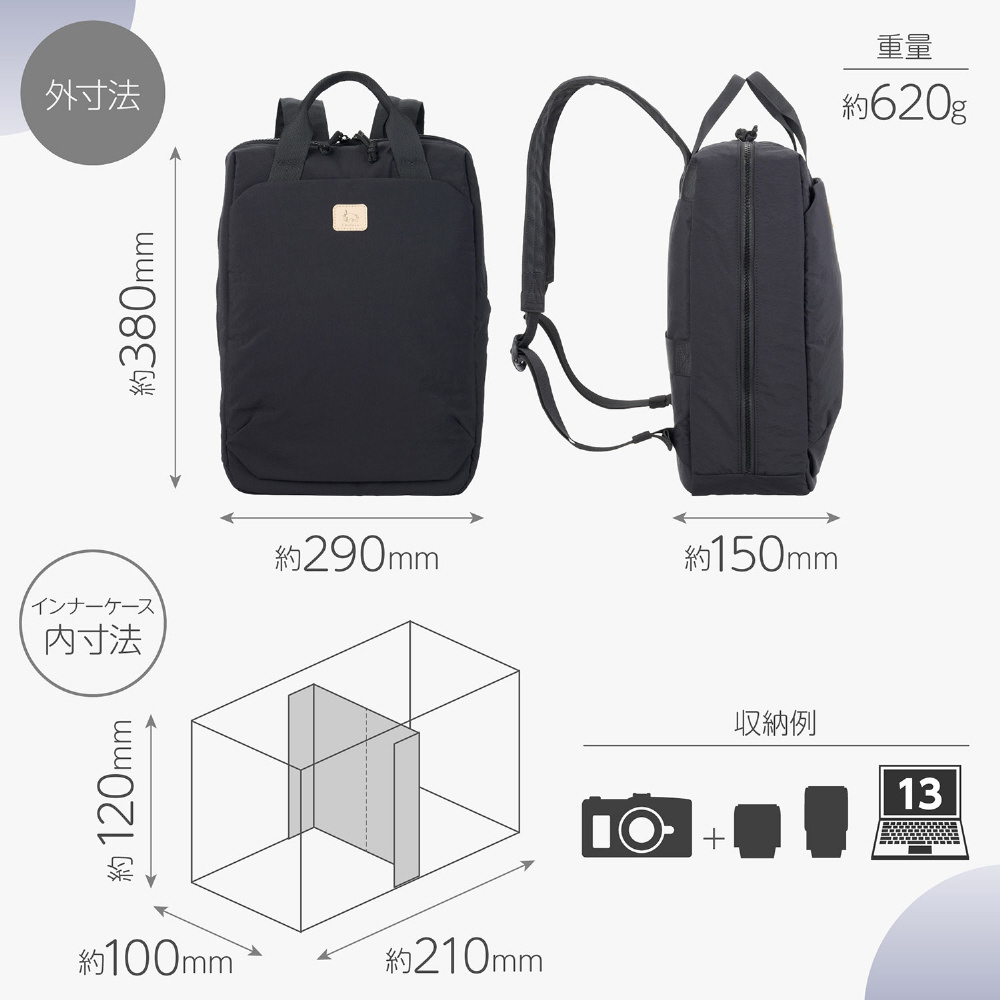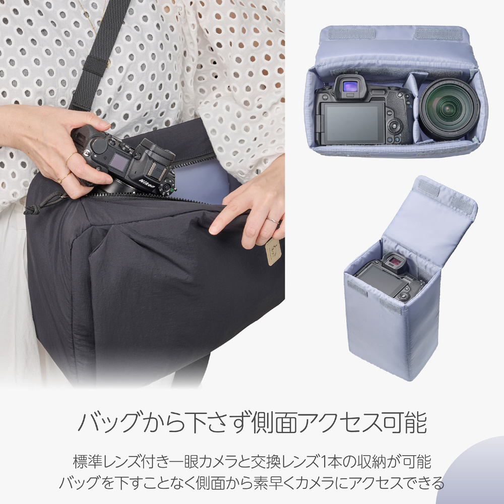やさしい手触りで普段使いもしやすいインナーケース式のカメラバックパック